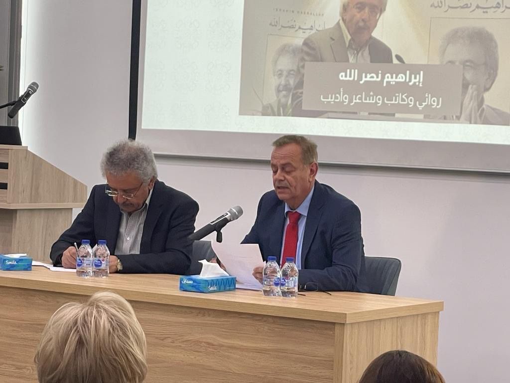 وتحدث نصر الله عن أعماله الأدبية بتسلسل تاريخي، مشيرا الى روايته "زمن الخيول البيضاء" التي صدرت باللغات الإنجليزية والفارسية والمقدونية