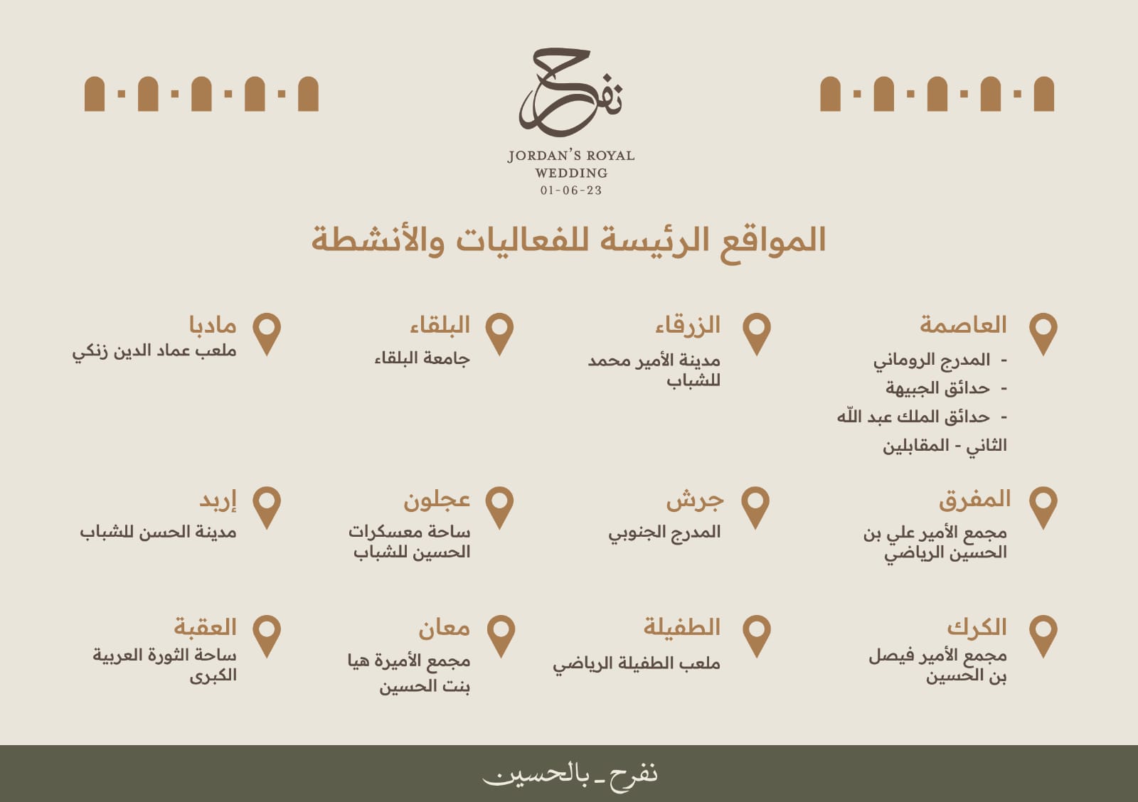 القلعة نيوز - احتفاءً بعقد قران سمو الأمير الحسين بن عبد الله الثاني، ولي العهد، على الآنسة رجوة خالد السيف، أعلنت وزارة الثقافة عن برنامج فعاليات وأنشطة احتفالية ستقام يوم الخميس المقبل في جميع محافظات المملكة.