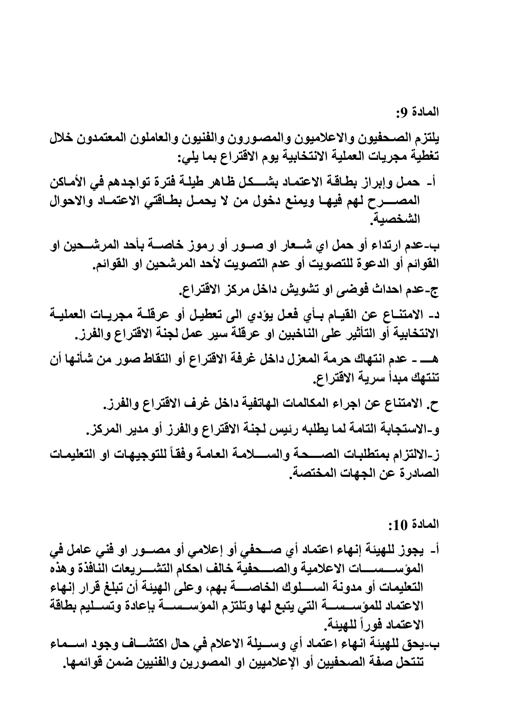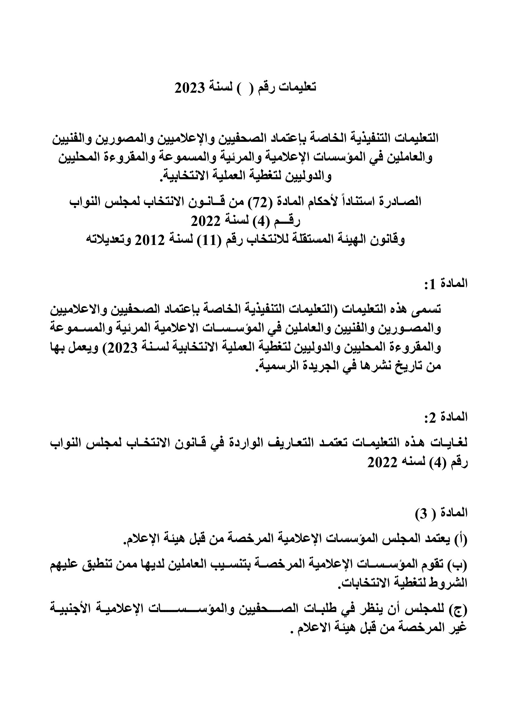 القلعة نيوز - نشرت الهيئة المستقلة للانتخاب على موقعها الالكتروني مسودة التعليمات التنفيذية الخاصة باعتماد الصحفيين والإعلاميين والمصورين والفنيين والعاملين في المؤسسات الإعلامية، المرئية والمسموعة والمقروءة المحلية والدولية لتغطية العملية الانتخابية.