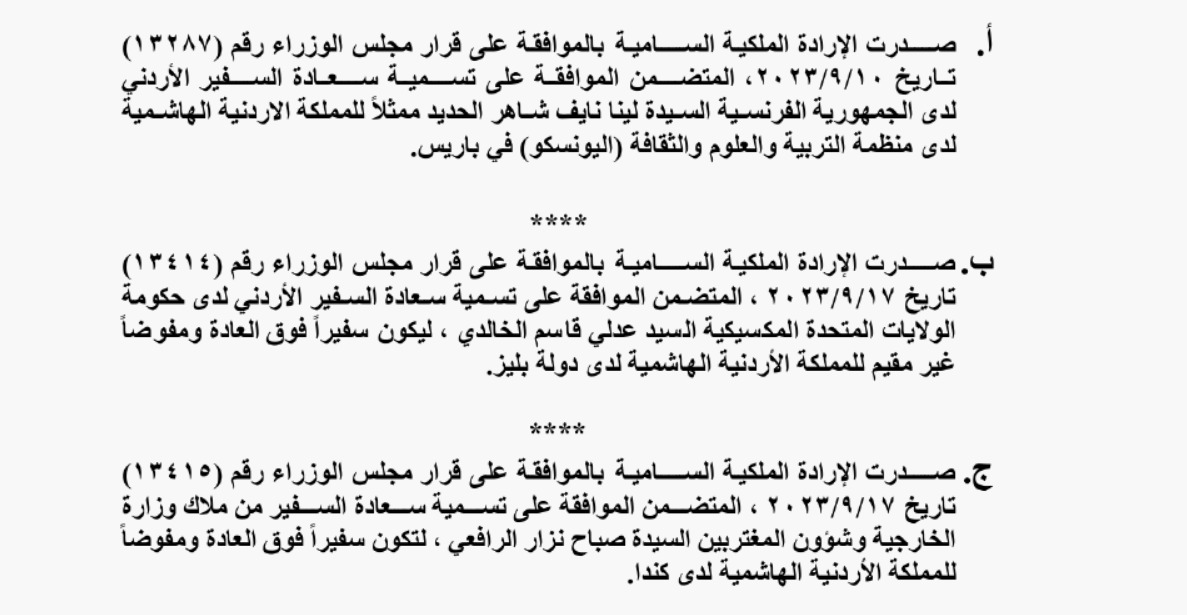 كما صدرت الإرادة الملكية السامية بتسمية السفير الأردني لدى الولايات المتحدة المكسيكية عدلي الخالدي ليكون سفيرا فوق العادة ومفوضا غير مقيم للمملكة الأردنية الهاشمية لدى دولة بليز.