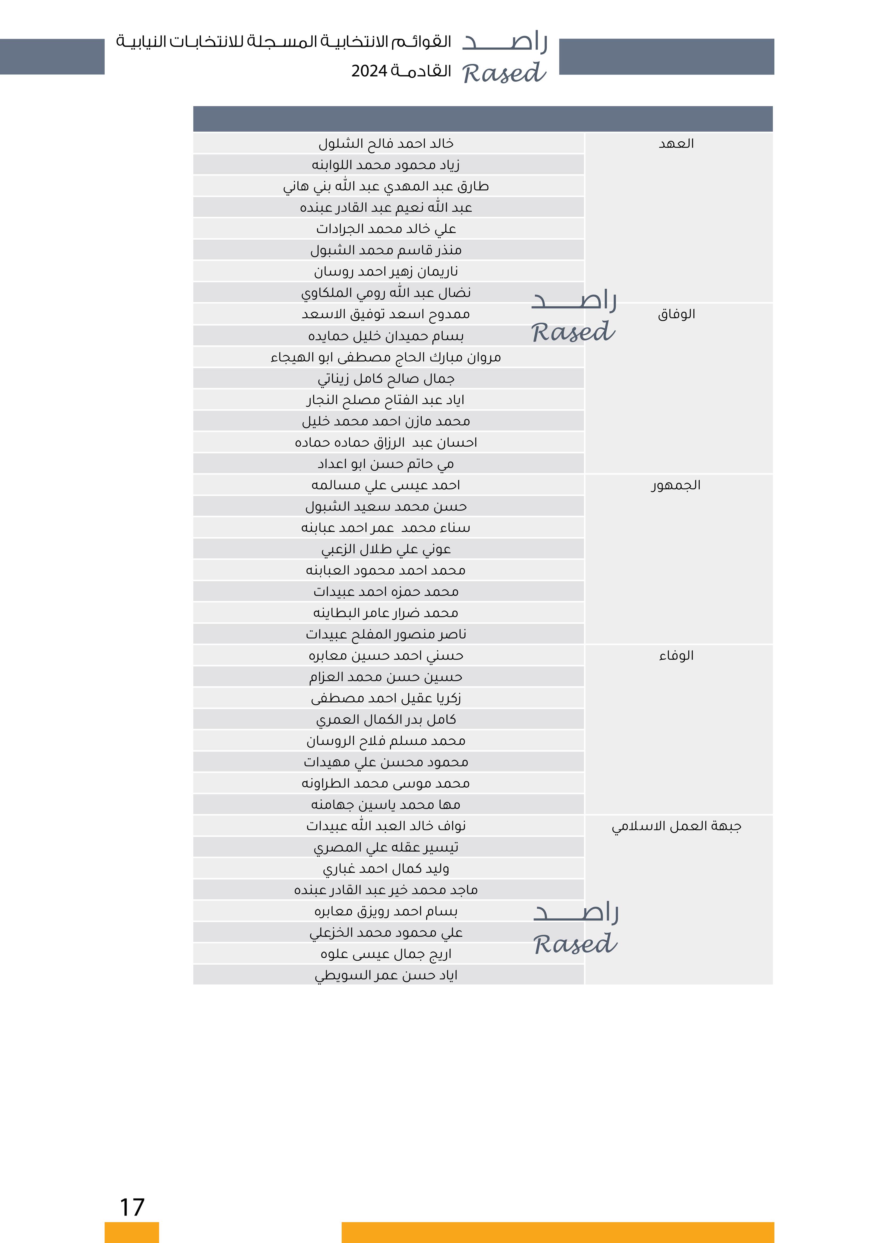 القلعة نيوز- استكمالاً لعمل مركز راصد ضمن عملية مراقبة عملية تسجيل المرشحين، ينشر راصد اسماء القوائم الانتخابية الأولية والمترشحات والمترشحين على مستوى الدوائر المحلية.