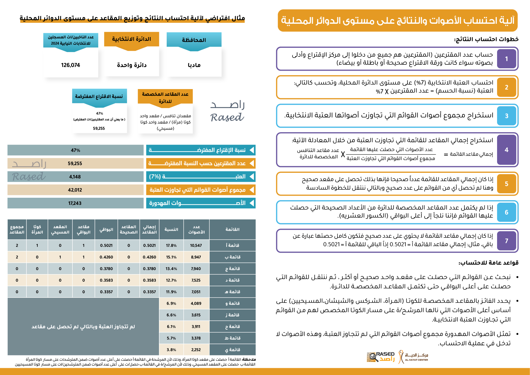 ويأتي إعداد هذه الأمثلة كجزء من جهود راصد لتعزيز الشفافية وتقديم أدوات تحليلية تساعد القوائم المترشحة والناخبين ووسائل الإعلام على فهم أفضل للنظام الانتخابي وكيفية عمله.
