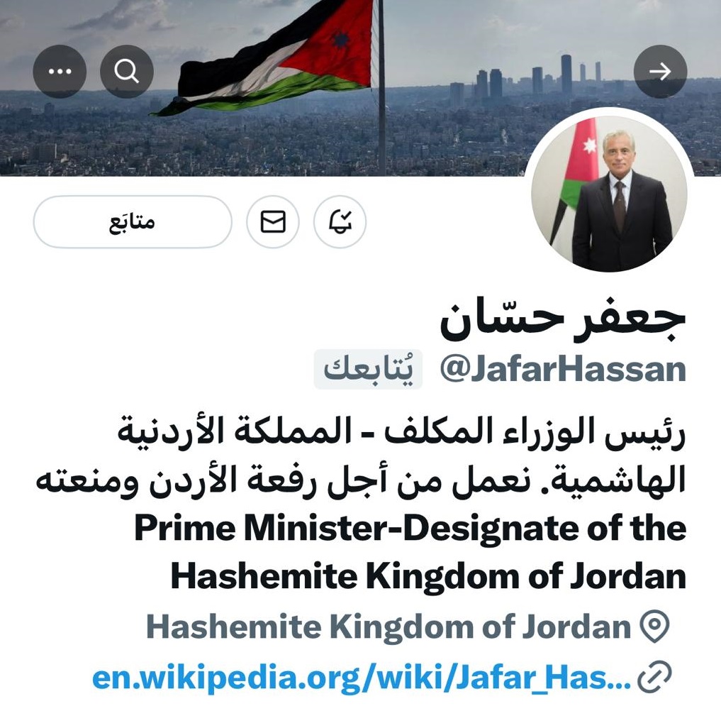 حسان كان عدل وصفه في تويتر بعد تكليفه من قبل جلالة الملك بتشكيل الحكومة الجديدة، إلى "رئيس وزراء المملكة الأردنية الهاشمية. نعمل من اجل رفعة الأردن ومنعته".