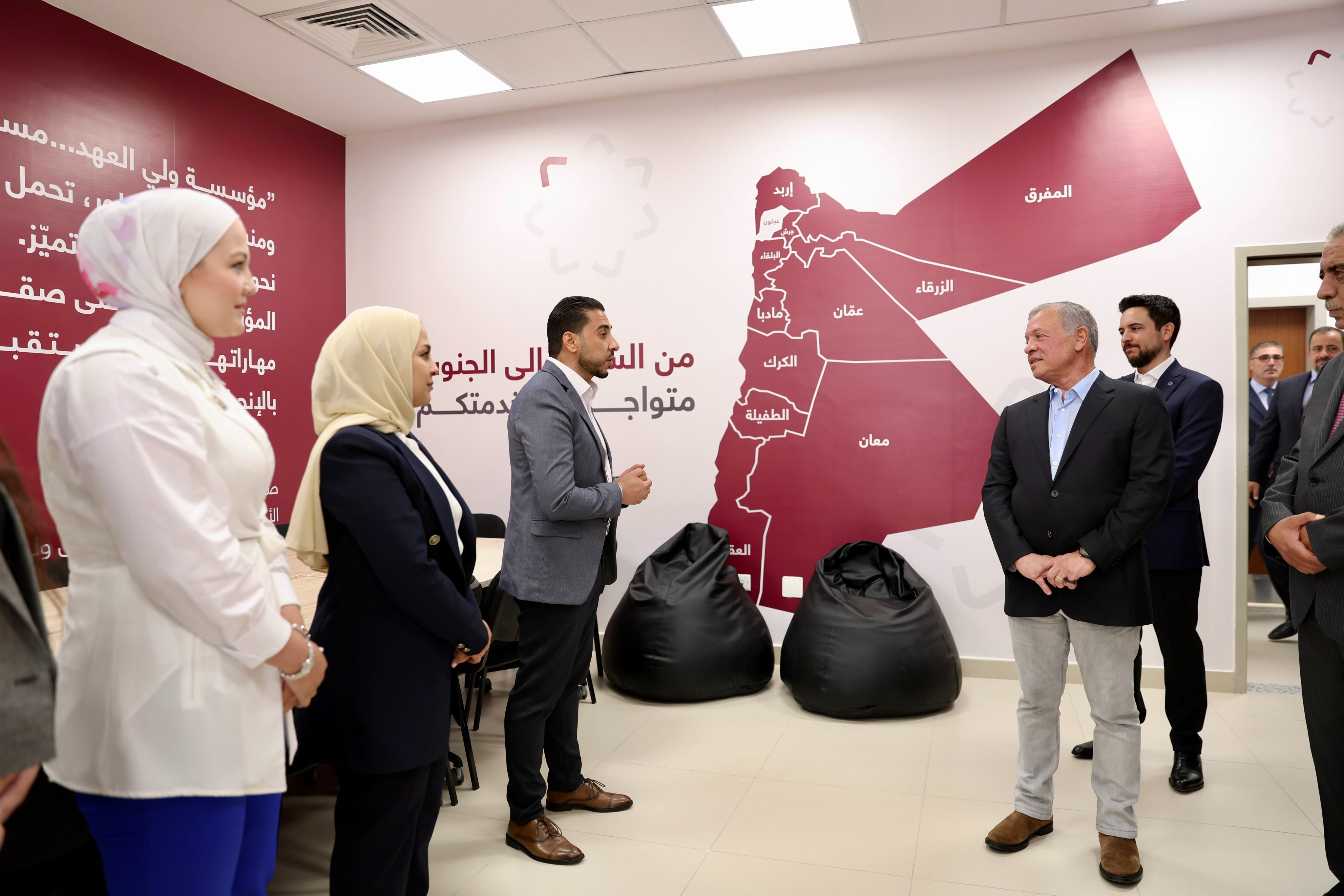 كما زار جلالة الملك مكتب مؤسسة ولي العهد في عجلون، واستمع إلى إيجاز من منسق المؤسسة لإقليم الشمال محمد الحناوي عن المكتب، الذي يوفر فرص التدريب للشباب على مهارات التواصل والقيادة والعمل الجماعي، والمهارات التقنية المتعلقة بالذكاء الاصطناعي والطباعة ثلاثية الأبعاد والبرمجة واللغة الإنجليزية والحاسوب، ويعقد جلسات توعوية عن المشاركة الاجتماعية والسياسية.