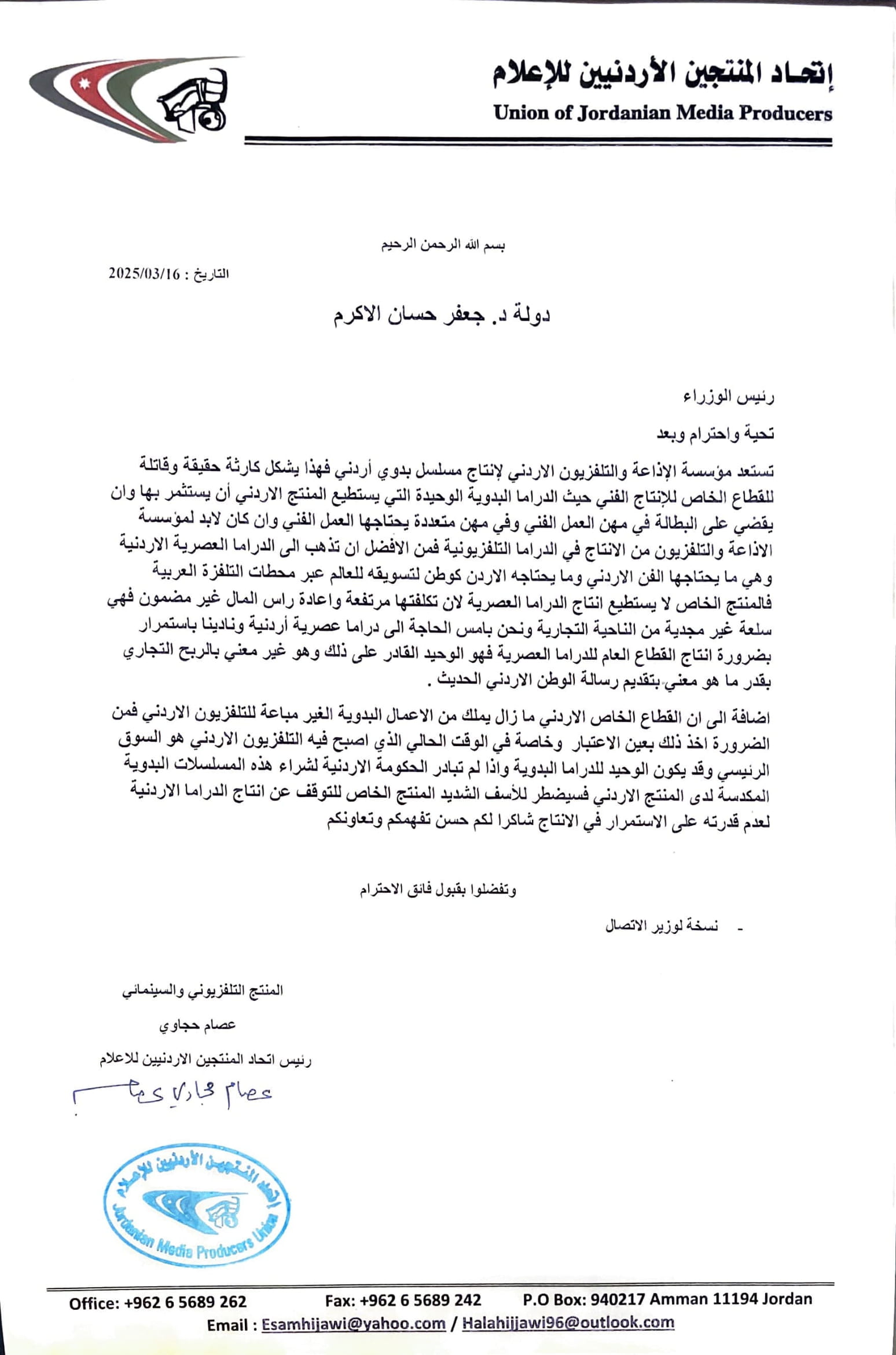 وجه اتحاد المنتجين الأردنيين كتابا إلى رئيس الوزراء الدكتور جعفر حسان، يحتج فيه على توجه التلفزيون الأردني لإنتاج مسلسل بدوي جديد، مطالبه بإنتاج دراما عصرية وترك البدوية للقطاع الخاص.