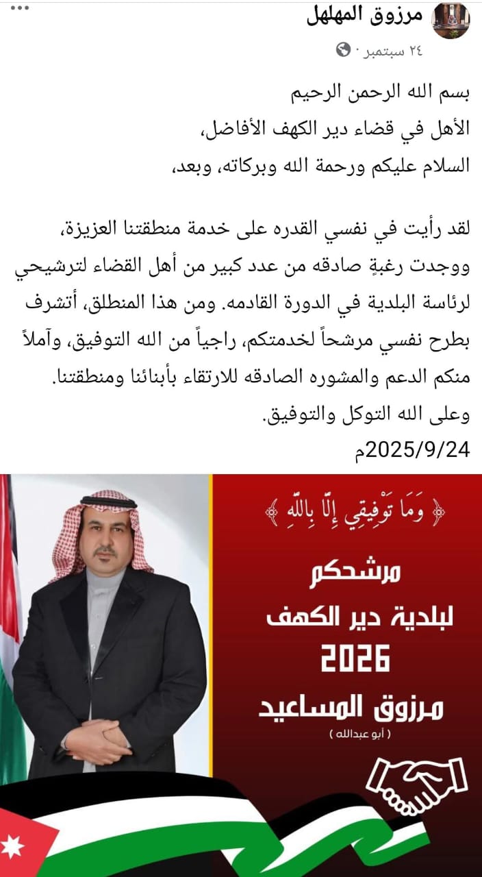القلعة نيوز- أعلن السيد "مرزوق المهلهل المساعيد "عن رغبته بالترشح لرئاسة بلدية دير الكهف في لواء البادية الشمالية الشرقية بمحافظة المفرق.