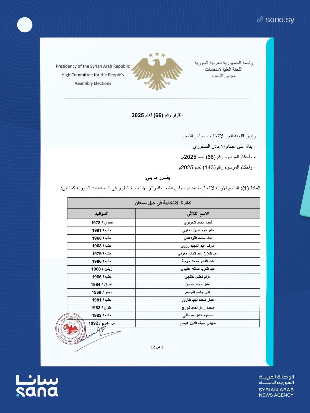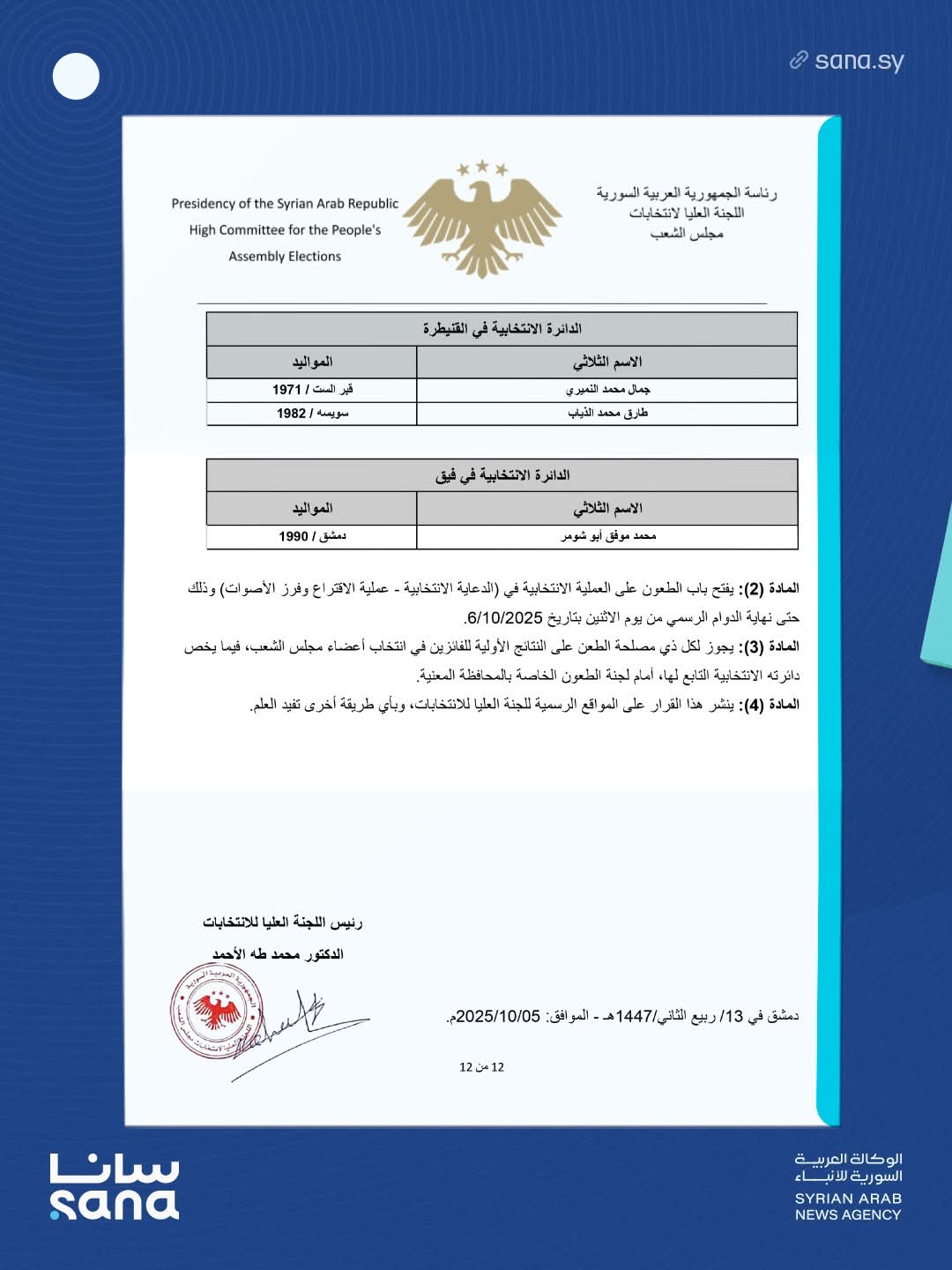 إعلان النتائج الأولية لانتخابات مجلس الشعب السوري وفتح باب الطعون