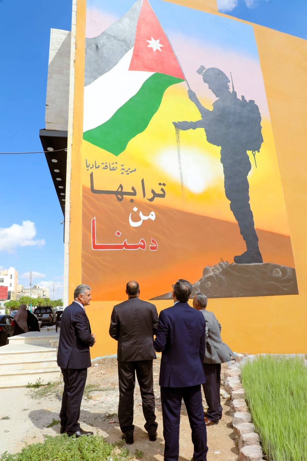 وقال عبر موقع "إكس "جدارية تجسّد روح الانتماء والفداء، حيث تتعانق راية الوطن مع هيبة الجندي، في مشهد يروي حكاية العزم والإخلاص في قلب محافظة مادبا.