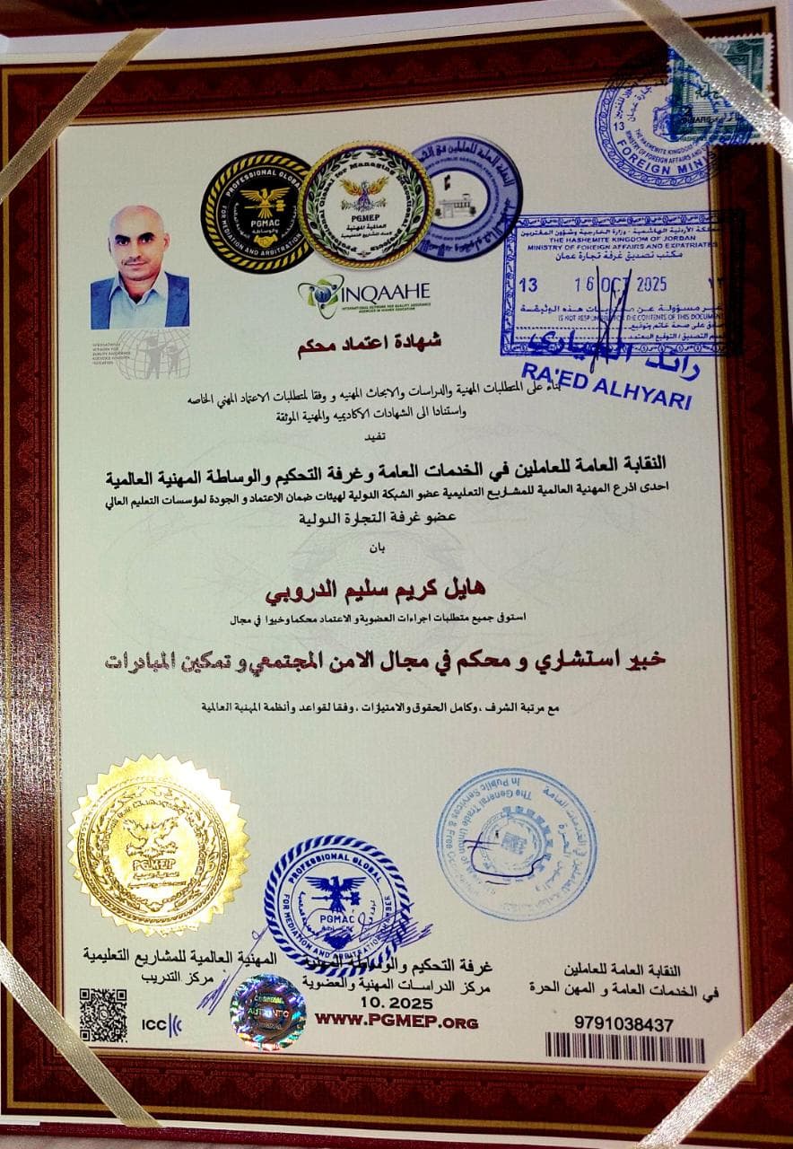 يتقدم السيد احمد الكعابنة بالتهنئة والتبريك إلى السيد هايل الدروبي العجارمة بمناسبة استوفاءه جميع متطلبات العضوية والاعتماد وخبيرا في مجال الأمن المجتمعي وتمكين المبادرات
