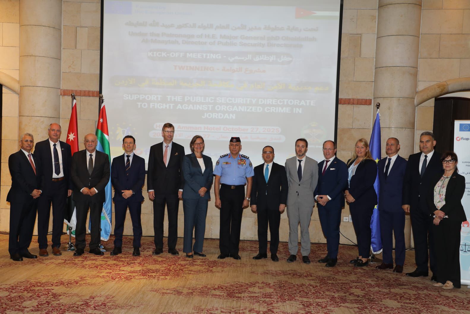 القلعة نيوز- رعى مدير الأمن العام، اللواء الدكتور عبيد الله المعايطة، اليوم الاثنين، حفل إطلاق مشروع التوأمة بين مديرية الأمن العام والاتحاد الأوروبي، الهادف إلى تعزيز قدرات التصدي للجريمة المنظمة العابرة للحدود مع ادارة البحث الجنائي والامن الوقائي ، وذلك بحضور سفير جمهورية ألمانيا الاتحادية في المملكة الدكتور بيرترام فون مولتكه، وسفيرة مملكة السويد في المملكة ماريا سارجرين، وممثلي بعثات الاتحاد الأوروبي والجهات الوطنية الشريكة.
