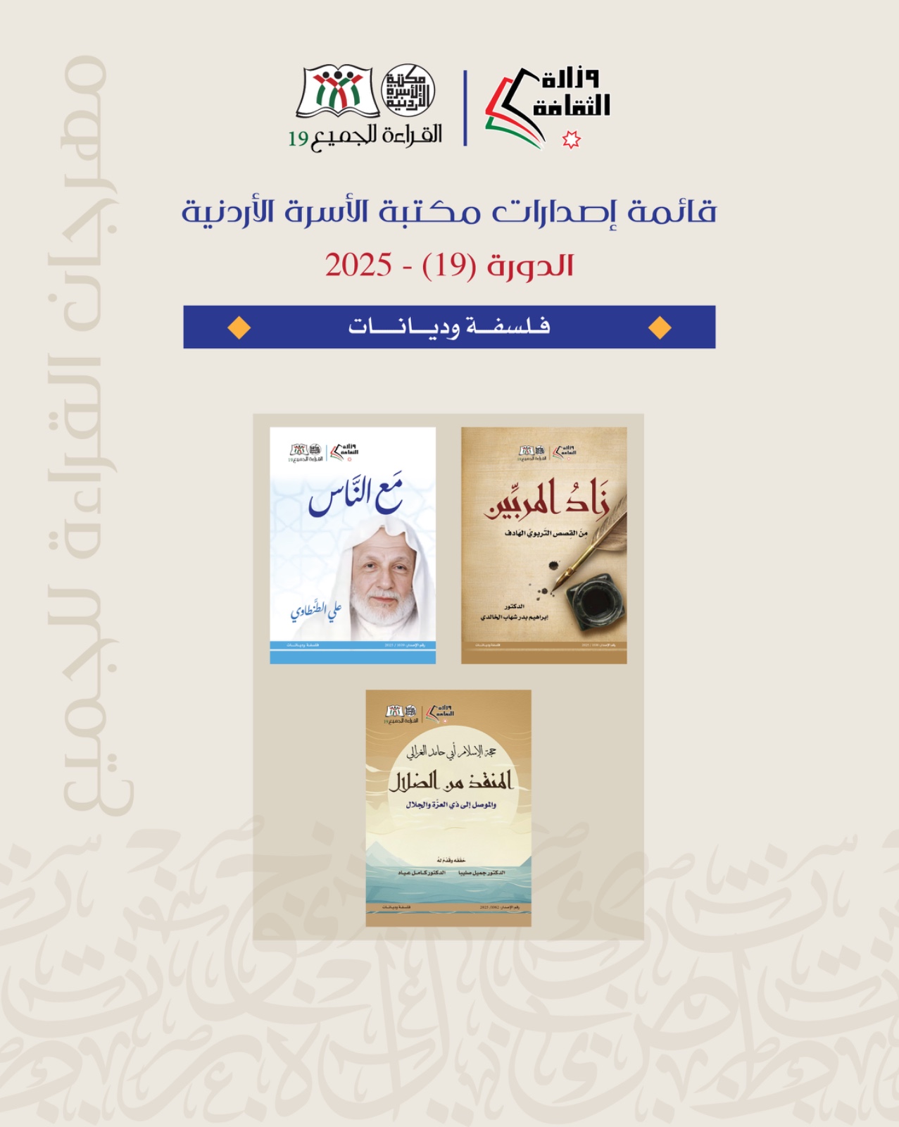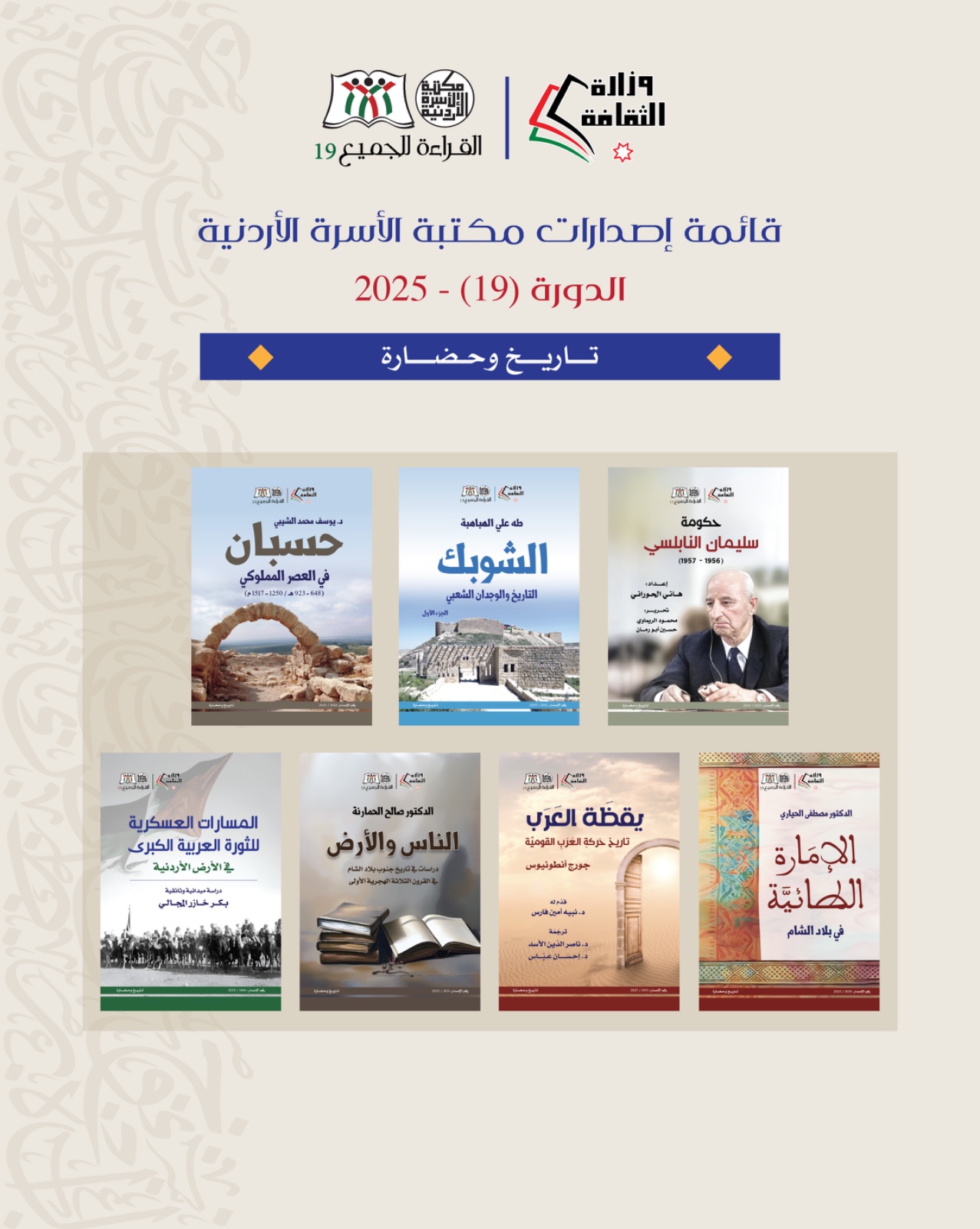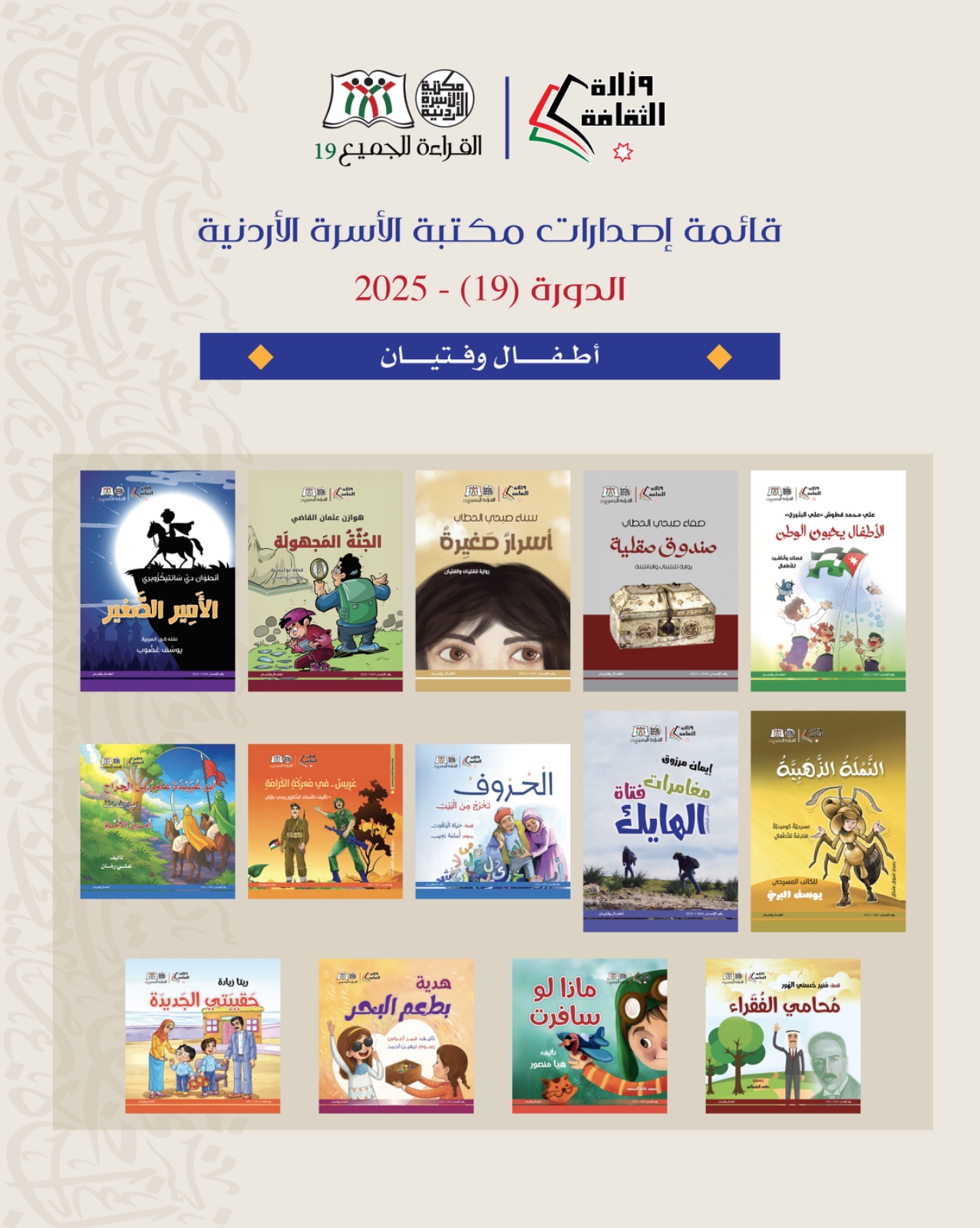 القلعة نيوز- برعاية دولة رئيس الوزراء الدكتور جعفر حسّان، تطلقُ وزارة الثقافة، من منطقة الريشة التابعة لبلدية وادي عربة، فعاليات برنامج مكتبة الأسرة الأردنية في دورته التاسعة عشرة، صباح يوم الأحد، الثاني من تشرين الثاني 2025، ولمدة خمسة أيام.