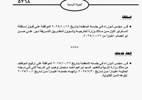 القلعة نيوز- صدر في عدد الجريدة الرسمية اليوم الخميس، قرارات مجلس الوزراء بإحالة عدد من موظفي الدولة إلى التقاعد، وانهاء خدمات اخرين.