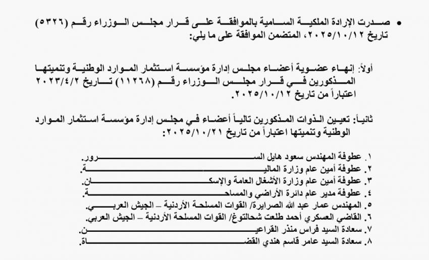 القلعة نيوز- صدرت الإرادة الملكية السامية بالموافقة على قرار مجلس الوزراء اليوم الخميس بتعيين المهندس سعود هايل السرور عضوًا في مجلس إدارة مؤسسة استثمار الموارد الوطنية وتنميتها.