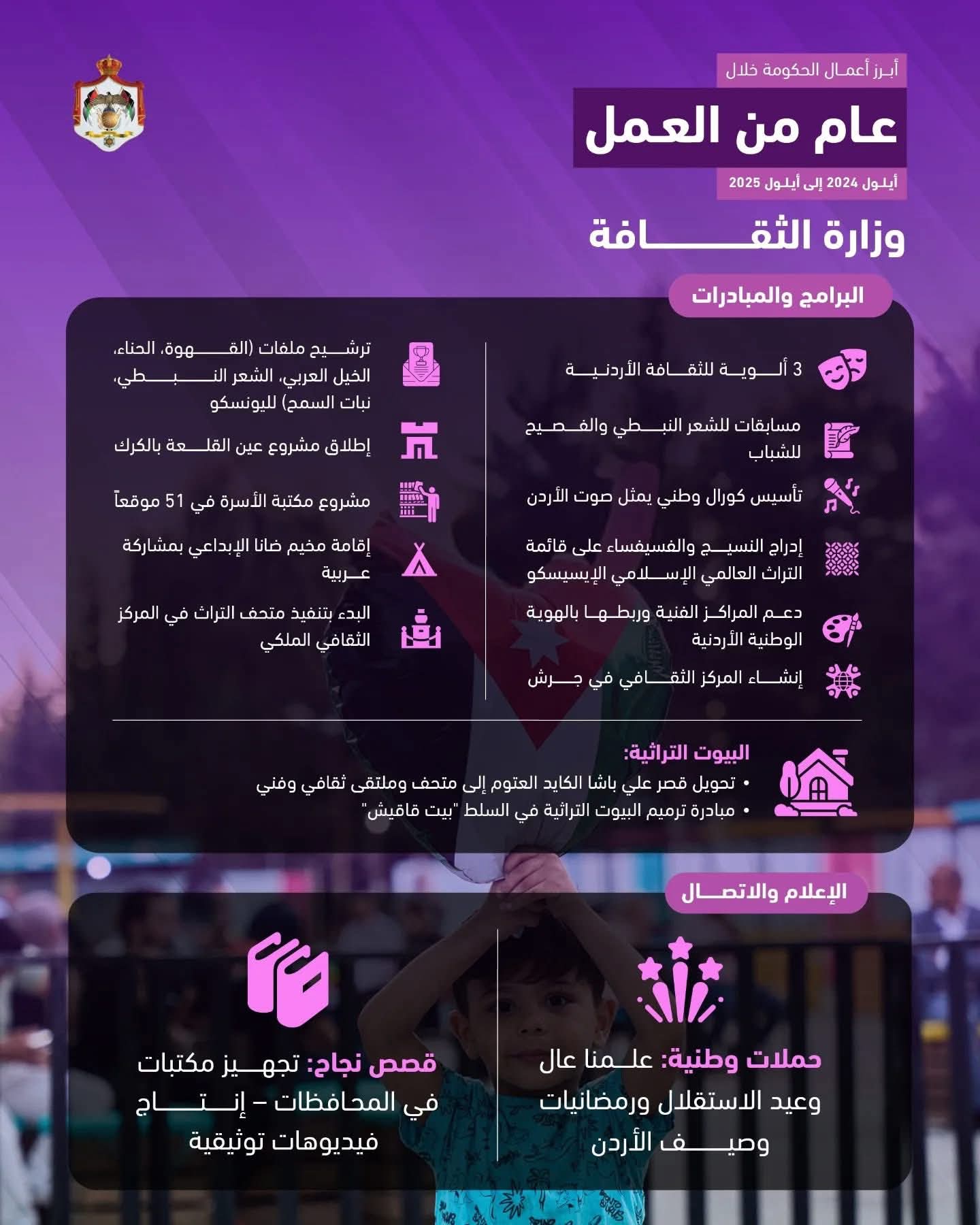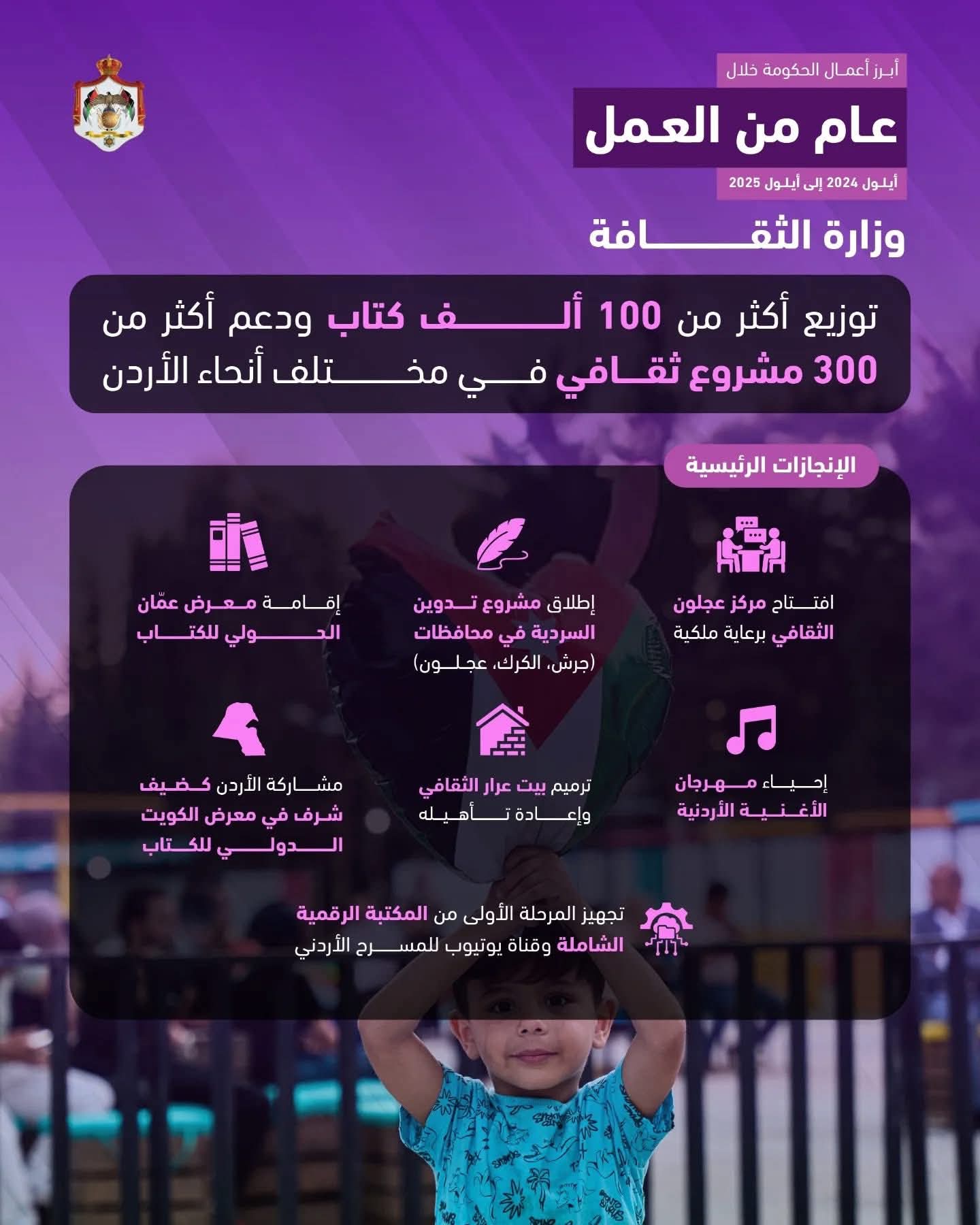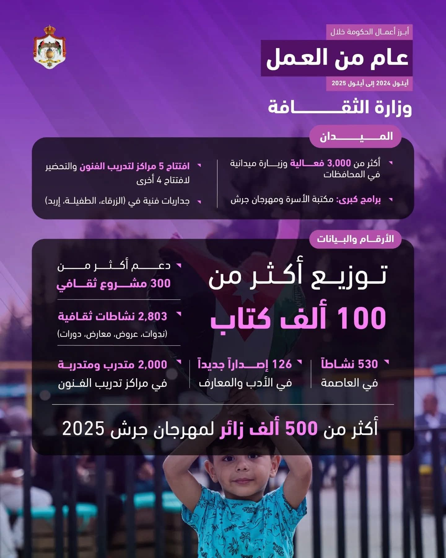 نشرت وزارة الاتصال الحكومي ملخصًا لأبرز أعمال وزارة الثقافة الأردنية خلال عام من العمل الممتد بين "أيلول 2024 و أيلول 2025" شمل أنشطتها الثقافية والجولات الميدانية والبرامج والفعاليات التي أقيمت في انحاء الأردن.