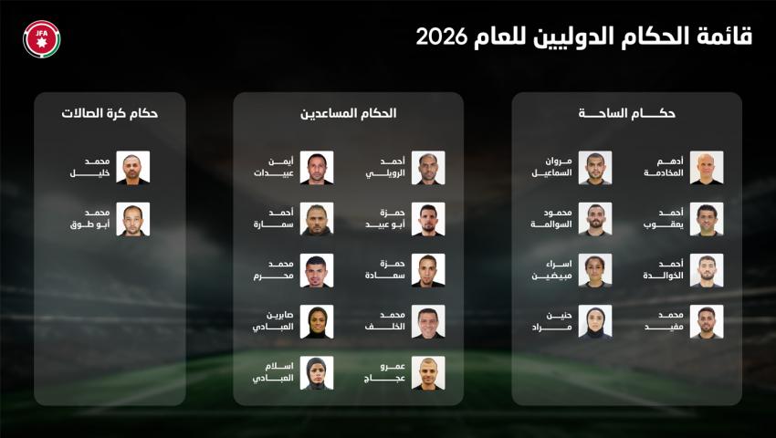 القلعة نيوز - أعلن الاتحاد الأردني لكرة القدم، قائمة الحكام الدوليين للعام 2026، والتي ضمت 8 للساحة، 10 مساعدين، واثنين للصالات.