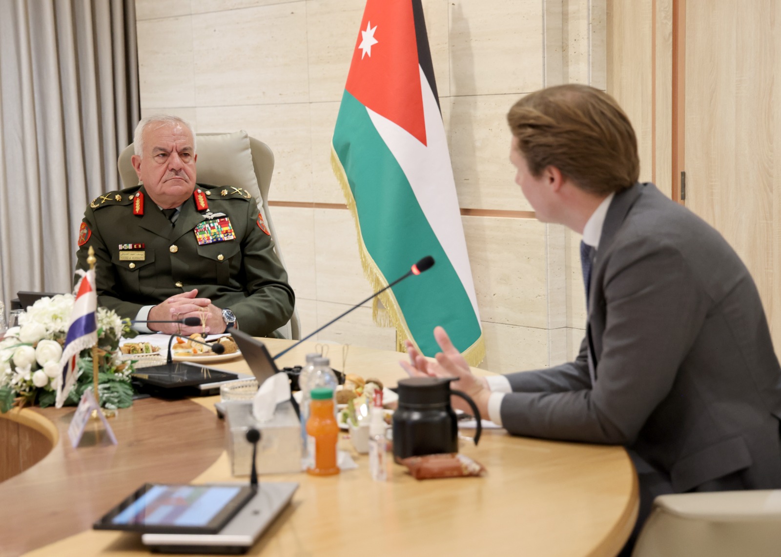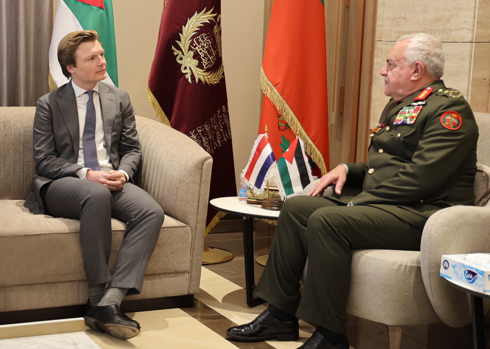 وبحث اللواء الركن الحنيطي مع الضيف، سبل تعزيز التعاون العسكري بين القوات المسلحة الأردنية ونظيرتها الهولندية، وتوسيع مجالات الشراكة في مختلف المجالات وتبادل الخبرات العسكرية، بما يسهم في دعم الجهود المشتركة وتعزيز القدرات الدفاعية لدى الجانبين.