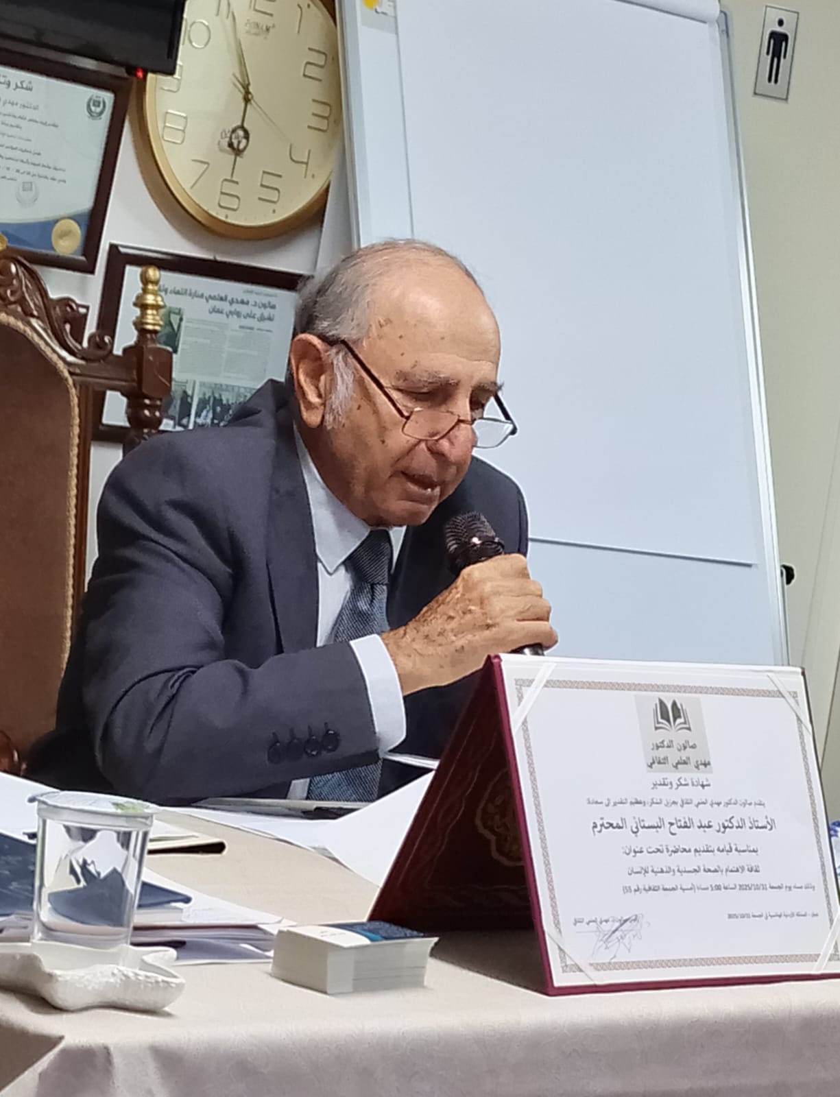 إنتقل بعد ذلك الدكتور بستاني للحديث عن ثقافة الاهتمام بالصحة الذهنية والقدرات العقلية للإنسان... حيث ذكر بأن التقدم في العمر يولد تغيرات جسدية وذهنية ثقيلة، نتيجة التراجع في امتصاص البروتين والنقص في إنتاج الخلايا... إضافة إلى تصلب الشرايين التاجية للقلب، والشرايين المغذية للدماغ، مما يؤثر سلباً على صفاء الذهن ويمهد لتراجع الذاكرة ومهارات التفكير... الأمر الذي ربما يؤدي إلى الدخول في مرحلة من الخرف أو الزهايمر. ولتجنب ذلك كله يتوجب على الإنسان الحفاظ على صحة الدماغ والقدرات الذهنية، بالتزام الغذاء الصحي وممارسة الرياضة والنشاط البدني... والإهتمام بالمطالعة الجادة وحضور المحاضرات والمؤتمرات والحفاظ على علاقات الصداقة والتواصل الاجتماعي... وعلى من يمارس المهن الحرة أن لا يتقاعد عن العمل مهما تقدم به العمر، بل عليه أن يستمر في عمله على أن يقلص ساعات العمل بما يتفق مع قدرته الجسدية... كما أن ممارسة رياضة التأمل واليوغا وبعض الهوايات الذهنية جميعاً مفيدة لصحة الدماغ. وانتهى الدكتور بستاني الى القول بأن صحة الإنسان خلال حياته تعتمد على ركيزتين أساسيتين هما: صحة الجسم الجسدية، وصحة العقل الذهنية... وكلاهما يدعم الآخر. وقد حضر هذا اللقاء الثقافي نخبة من المثقفين وأصحاب الرأي والفكر المهتمين بالشأن العام في بلدنا الغالي في ظل الراية العربية الهاشمية.