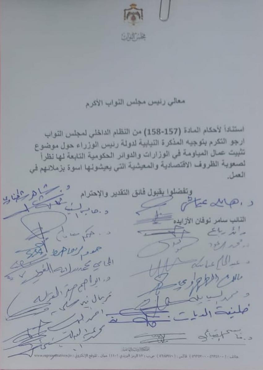 القلعة نيوز- طالبت مذكرة نيابية تبناها النائب سامر الازايدة، الحكومة بتثبيت عمال المياومة العاملين في الوزارات والدوائر الحكومية التابعة لها.