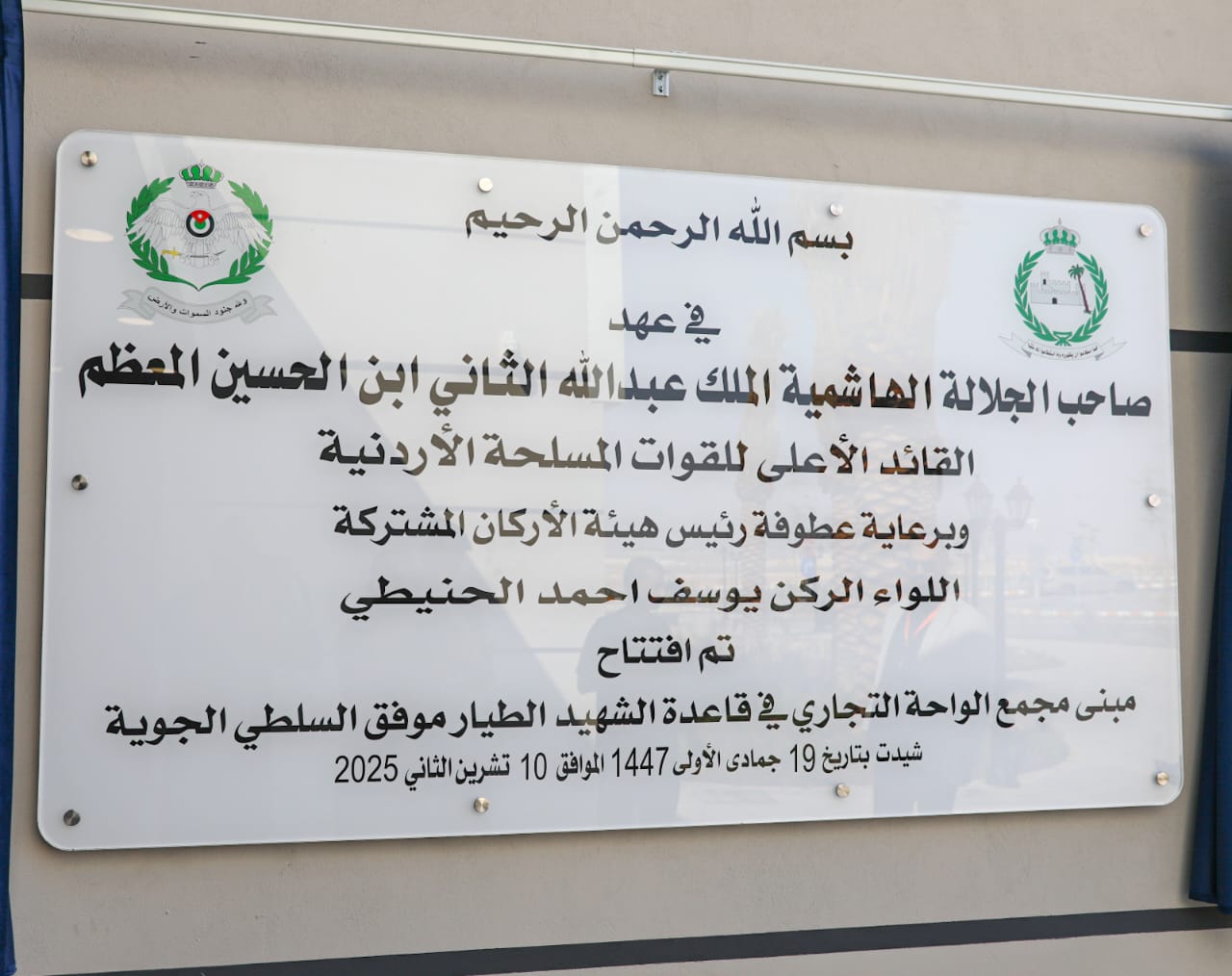 وفي سياق متصل، افتتح اللواء الركن الحنيطي مجمعاً تجارياً داخل القاعدة، تابع لشركة الولاء لخدمة العاملين في القوات المسلحة، والمخصص لتقديم الخدمات التموينية والترفيهية لمنتسبي القاعدة وذويهم، بما يسهم في تحسين بيئة العمل وتوفير الاحتياجات اليومية للعاملين ضمن موقع خدمتهم.