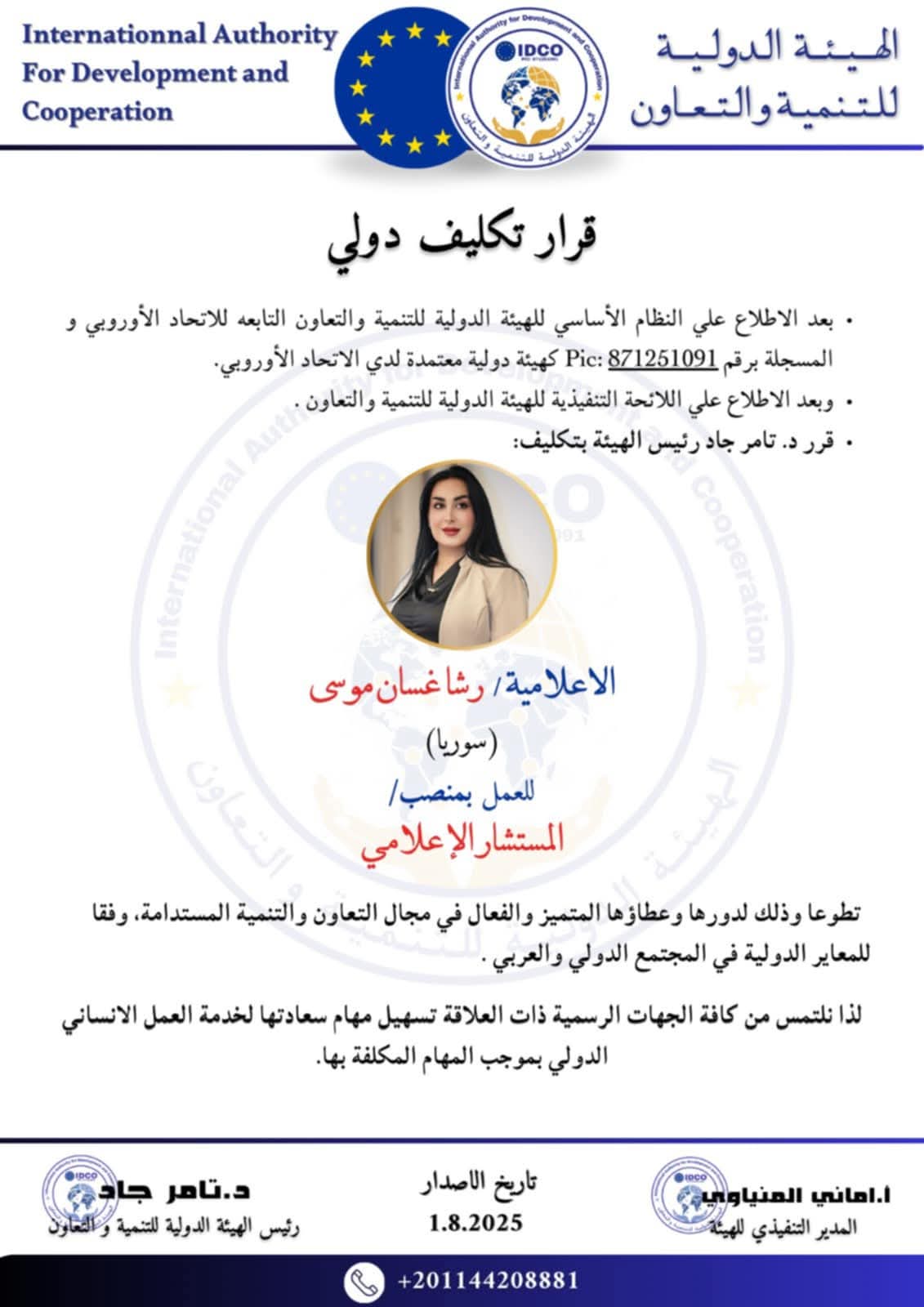"الإعلامية رشا موسى" مستشارًا إعلاميًا في الهيئة الدولية للتنمية والتعاون التابعة لاتحاد الأوروبي