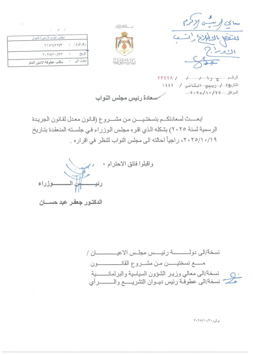 القلعة نيوز - أحال مجلس النواب اليوم الاثنين، مشروع القانون المعدل لقانون الجريدة الرسمية لسنة 2025 إلى لجنة التوجيه الوطني والإعلام.