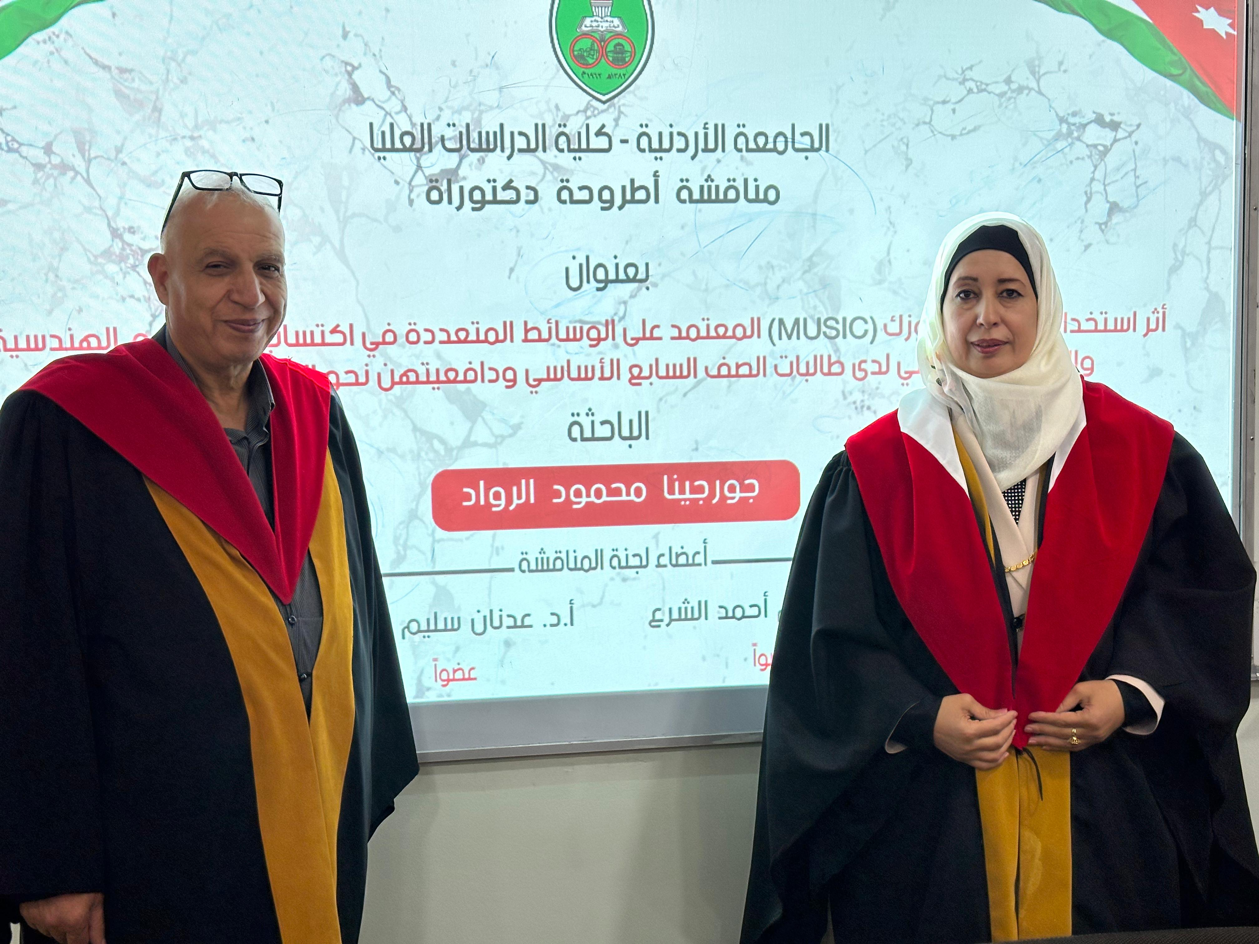 القلعة نيوز- بـفخر يلامس عنان السماء واعتزاز يتجاوز حدود الوصف .. تتهادى أسمى مشاعر التبريكات والتهاني من الأهل والعشيرة والأحبة إلى كريمتهم وفخرهم ، الدكتورة جورجينا محمود الرواد بمناسبة حصولها على درجة الدكتوراه بامتياز من الجامعة الأردنية في تخصص فلسفة مناهج وأساليب تدريس الرياضيات، وأطروحتها الموسومة بــ «أثر استخدام نموذج ميوزك (MUSIC) المعتمد على الوسائط المتعددة في اكتساب المفاهيم الهندسية والتفكير الهندسي لدى طالبات الصف السابع الأساسي ودافعيتهن نحو الهندسة في الأردن» تحت إشراف الأستاذ الدكتور خالد أبو لوم.