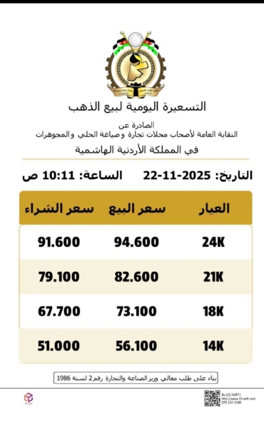 وبلغ سعر غرام الذهب عيار 21، الأكثر تداولاً بين المواطنين، 82.6 ديناراً.