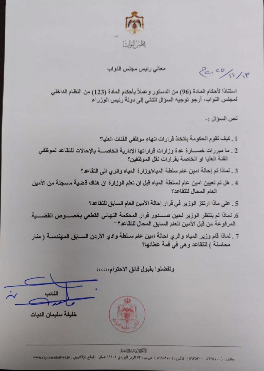 وتضمن السؤال النيابي استفسارات حول إحالة أمين عام سلطة المياه ووزارة المياه والري إلى التقاعد، وما إذا كانت الوزارة على علم بوجود قضية قضائية مسجلة قبل اتخاذ القرار، إضافة إلى الأسس التي اعتمد عليها الوزير في إحالة الأمين العام السابق للتقاعد.
