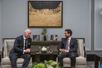 وعقد سمو ولي العهد لقاء مع رئيس الاتحاد الدولي لكرة القدم جياني إنفانتينو، على هامش الحفل، تناول سبل توسيع التعاون بين الأردن والاتحاد في المجال الرياضي.