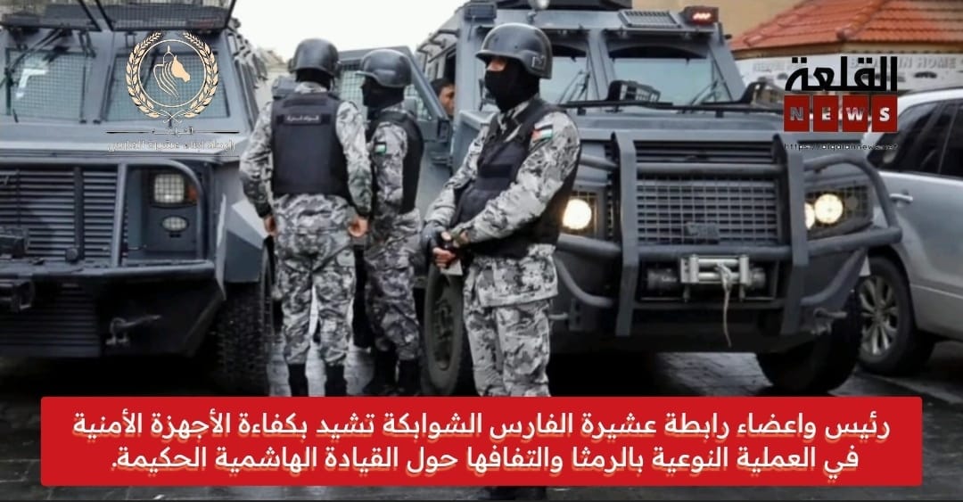 أشاد رئيس رابطة عشيرة الفارس الشوابكة الدكتور المحامي صايل علي الشوبكي واعضاء الرابطة وابناء عشيرة الفارس الشوابكة بالجهود الاستثنائية التي بذلتها الأجهزة الأمنية خلال العملية النوعية التي نُفذت في لواء الرمثا، مؤكداً أن هذه الجهود تجسّد مستوى الاحترافية واليقظة التي يتمتع بها جهاز الأمن الأردني في حماية الوطن.
