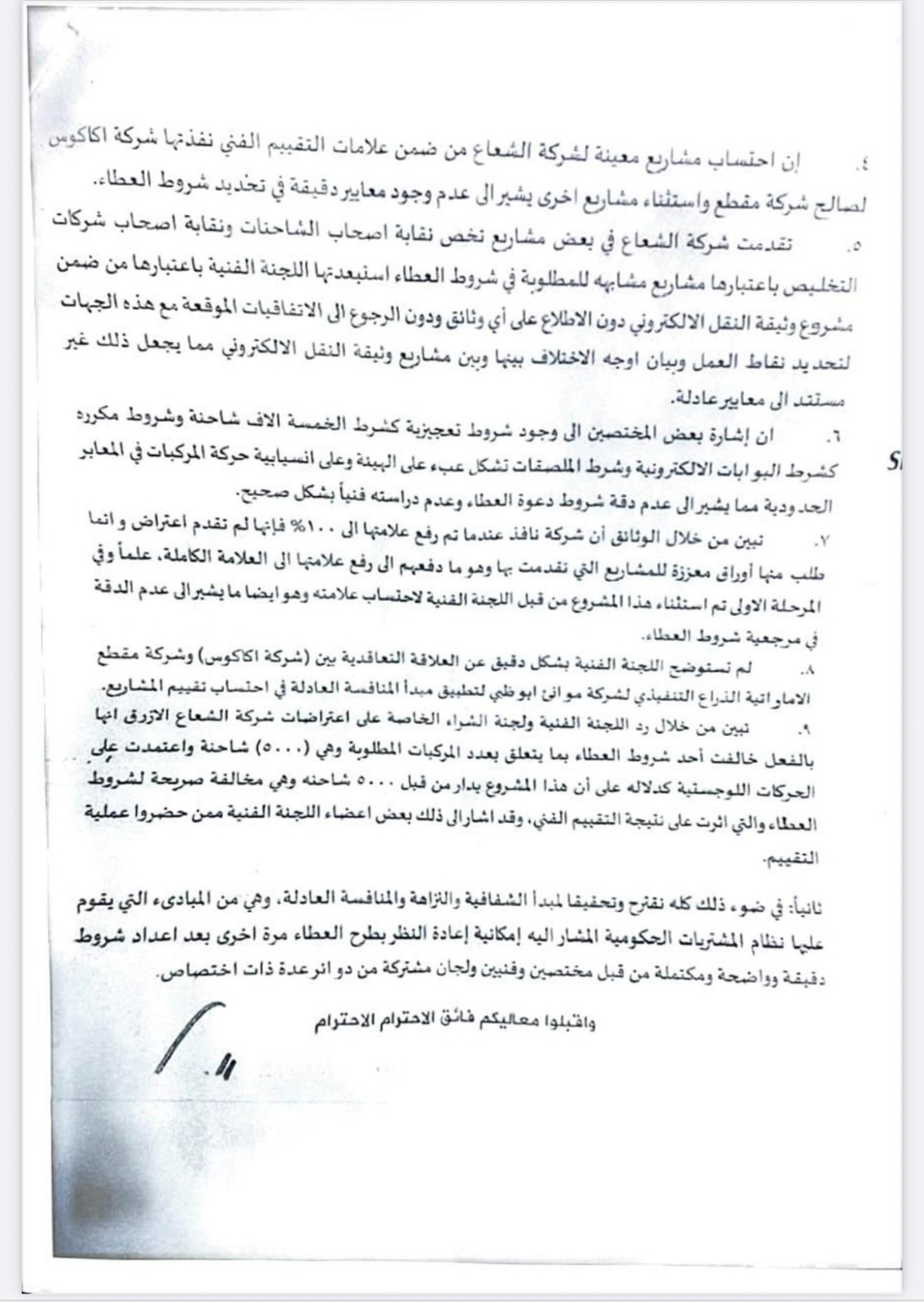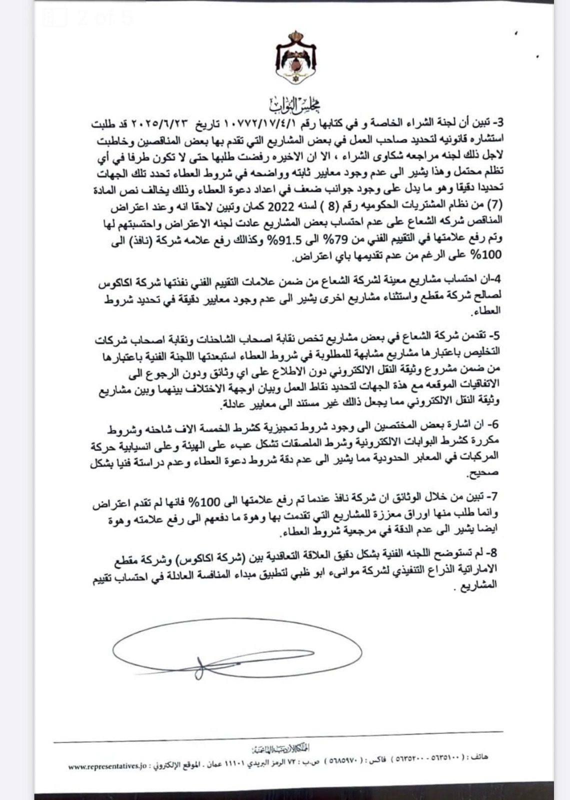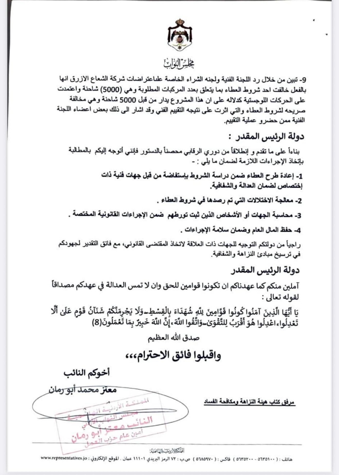 مستهجناً بذات الوقت أن وزارة النقل لا زالت ترفض الامتثال لقرار هيئة النزاهة و مكافحة الفساد بخصوص العطاء رقم ١ / ٢٤ التابع لهيئة النقل البري "والقاضي برفض مخرجات لجنة الشراء والتوصية باعادة طرح العطاء" في حين تستمر لجنة الشراء بإجراءات الإحالة بمخالفة صريحة للقانون!.