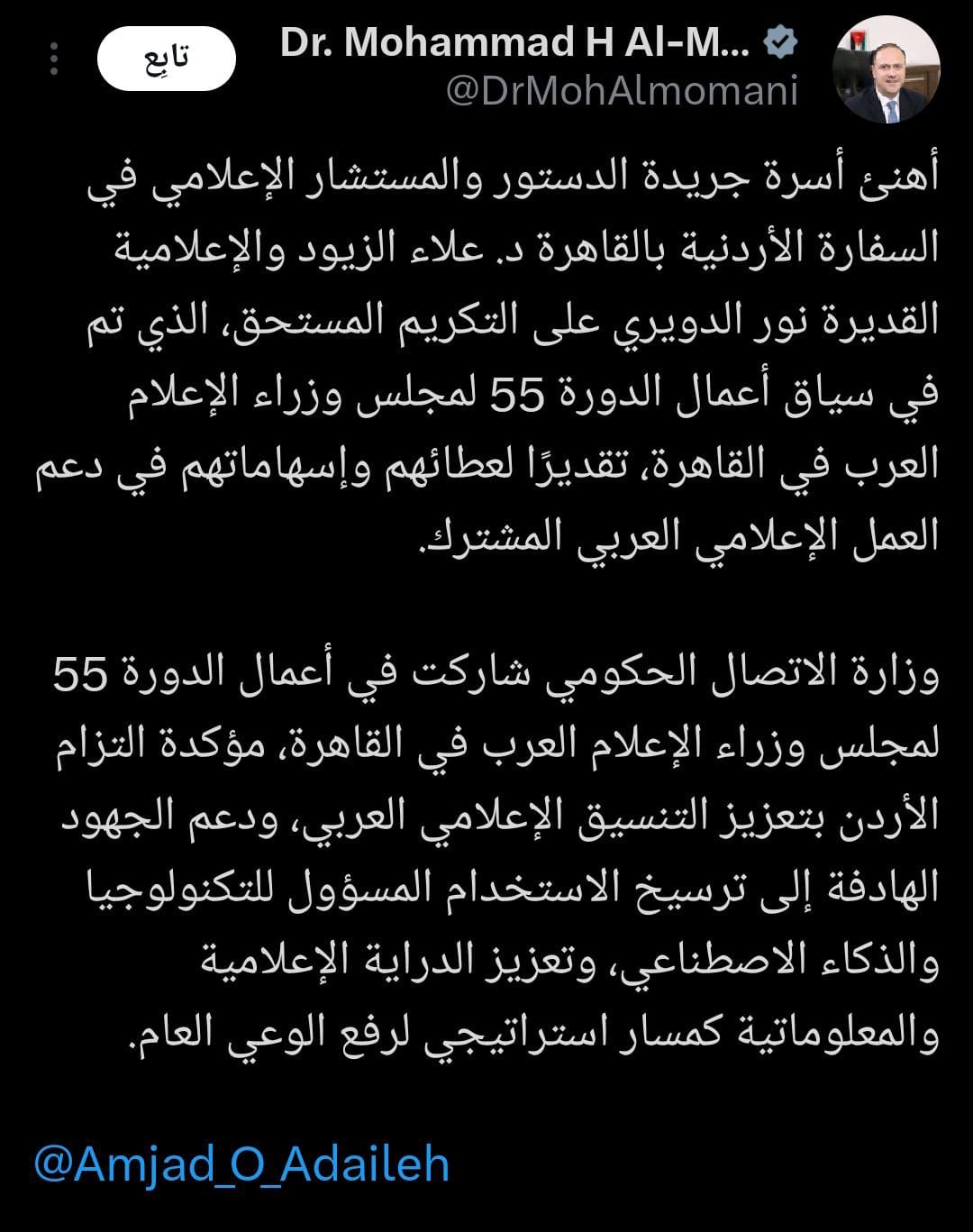 القلعة نيوز- هنأ وزير الاتصال الحكومي محمد المومني أسرة جريدة الدستور والمستشار الإعلامي في السفارة الأردنية بالقاهرة د. علاء الزيود والإعلامية القديرة نور الدويري على التكريم المستحق، الذي تم في سياق أعمال الدورة 55 لمجلس وزراء الإعلام العرب في القاهرة، تقديرًا لعطائهم وإسهاماتهم في دعم العمل الإعلامي العربي المشترك.