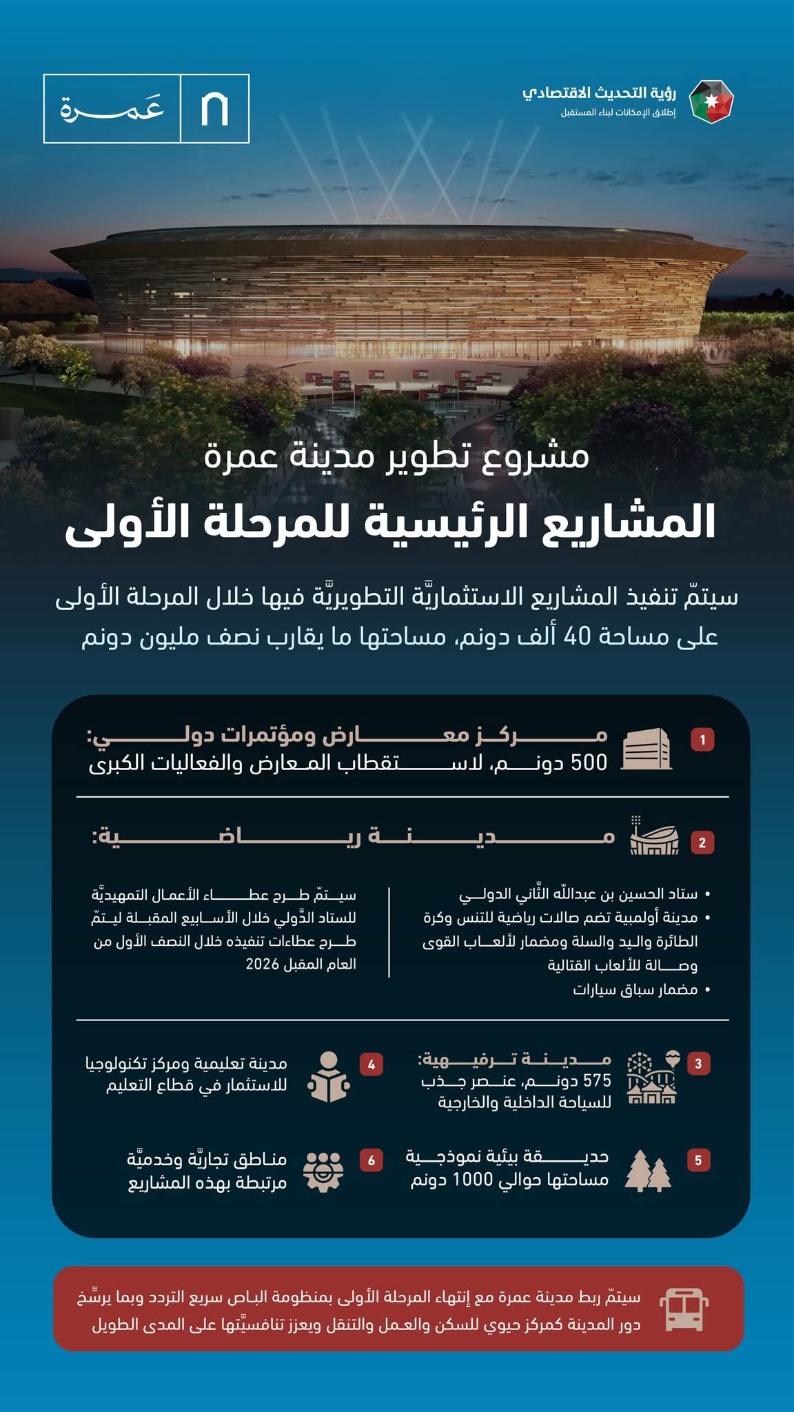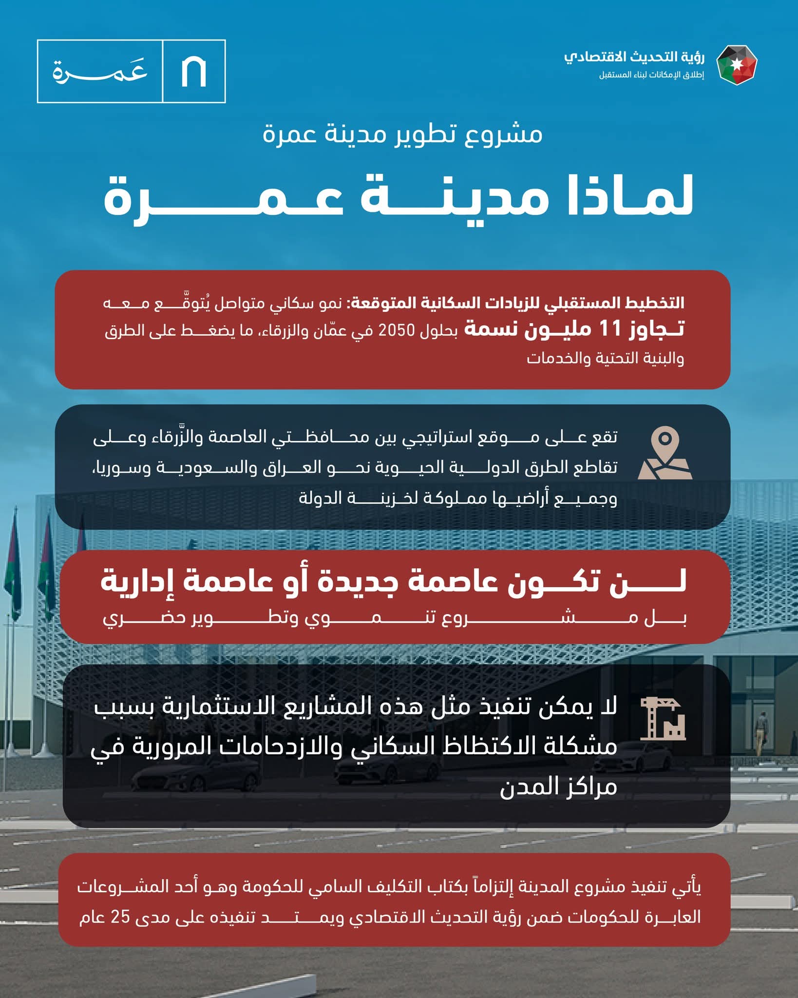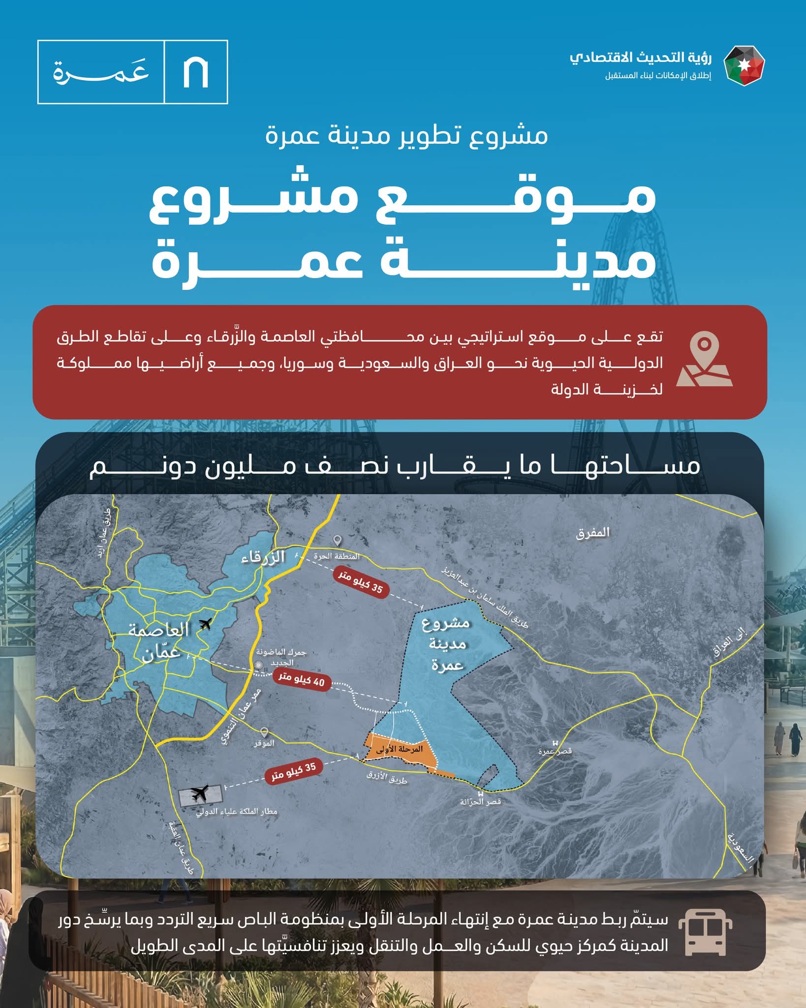 القلعة نيوز- أعلنت الحكومة اليوم السبت، أبرز مشاريع المرحلة الأولى في المدينة الجديدة "عمرة"، التي اطلق مشروعها رئيس الوزراء الدكتور جعفر حسان.