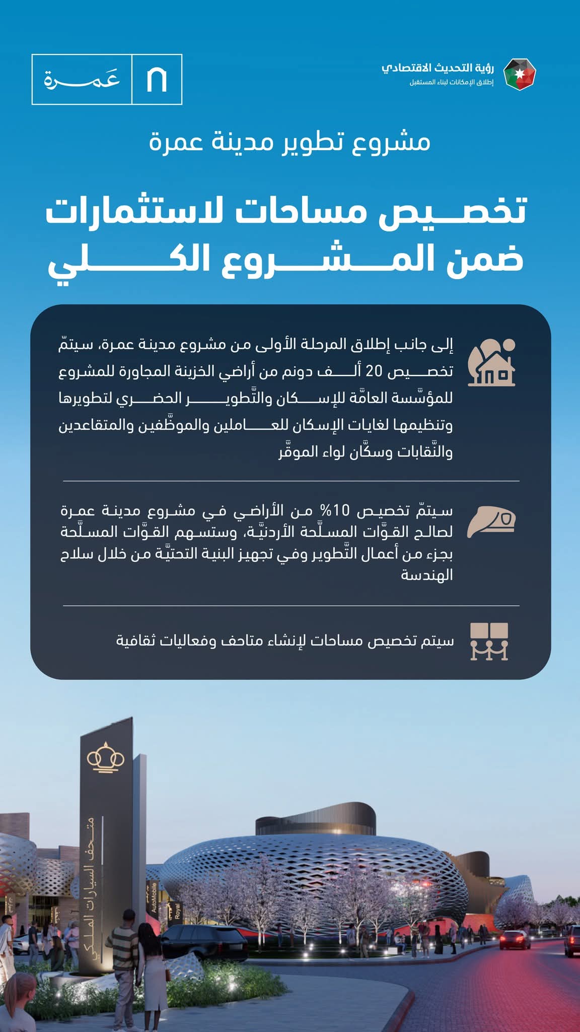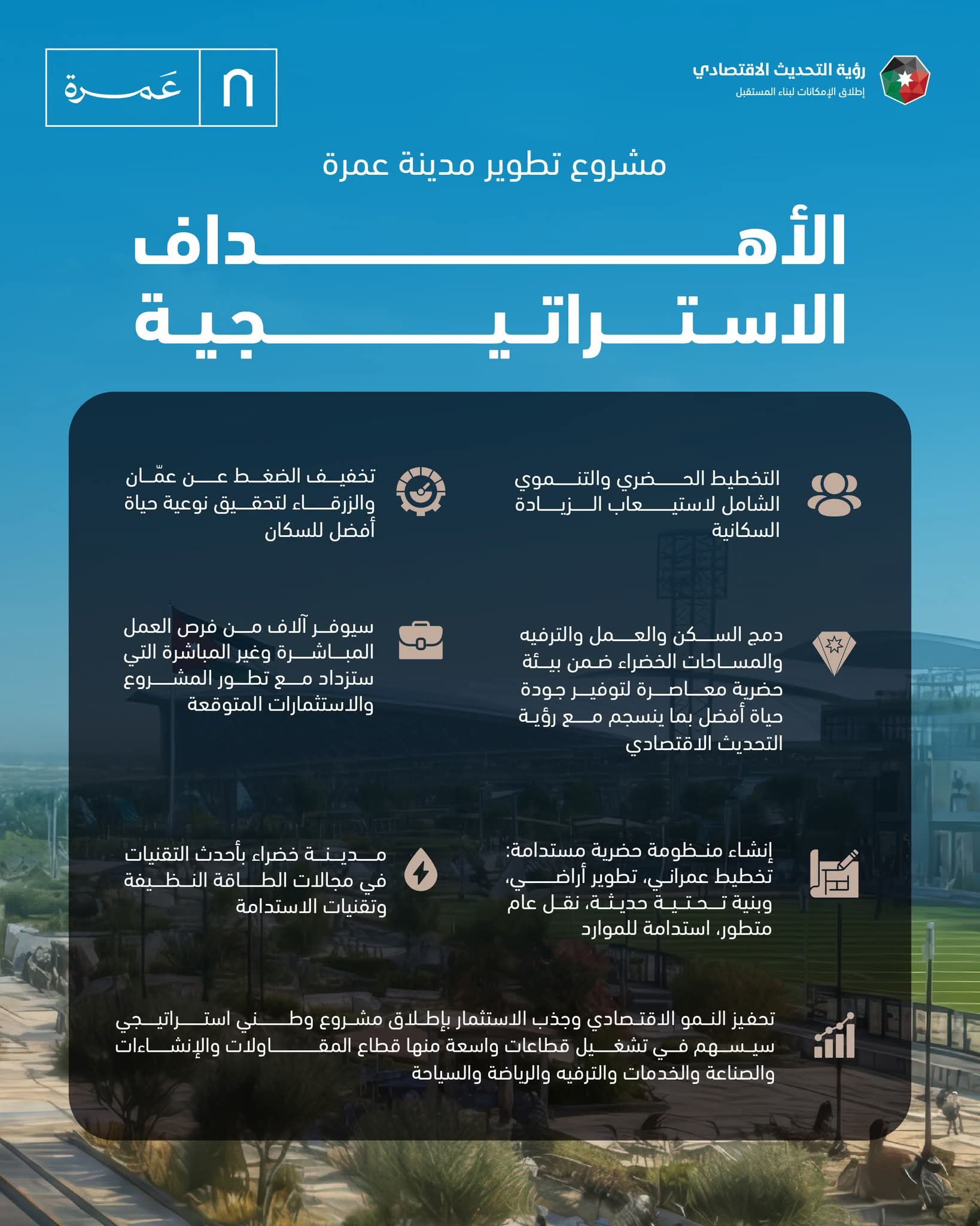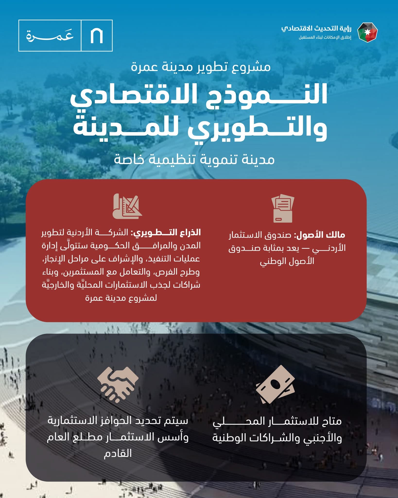 القلعة نيوز- أعلنت الحكومة اليوم السبت، أبرز مشاريع المرحلة الأولى في المدينة الجديدة "عمرة"، التي اطلق مشروعها رئيس الوزراء الدكتور جعفر حسان.
