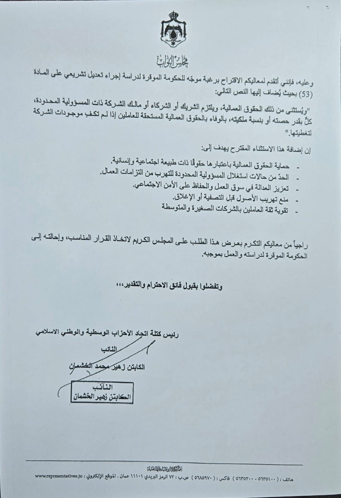 في خطوة وُصفت بأنها انتصار للعمّال ووقفٌ أمام ما سمّاه البعض "ثغرة تهرّب الشركات من حقوق الناس”، تقدم النائب الكابتن زهير الخشمان رئيس كتلة اتحاد الاحزاب الوسطية والوطني الاسلامي النيابية باقتراح برغبة لتعديل المادة (53) من قانون الشركات، وهي المادة التي طالما اشتكى منها موظفون وعمال فقدوا حقوقهم بعد إغلاق شركاتهم أو هروب مالكيها.