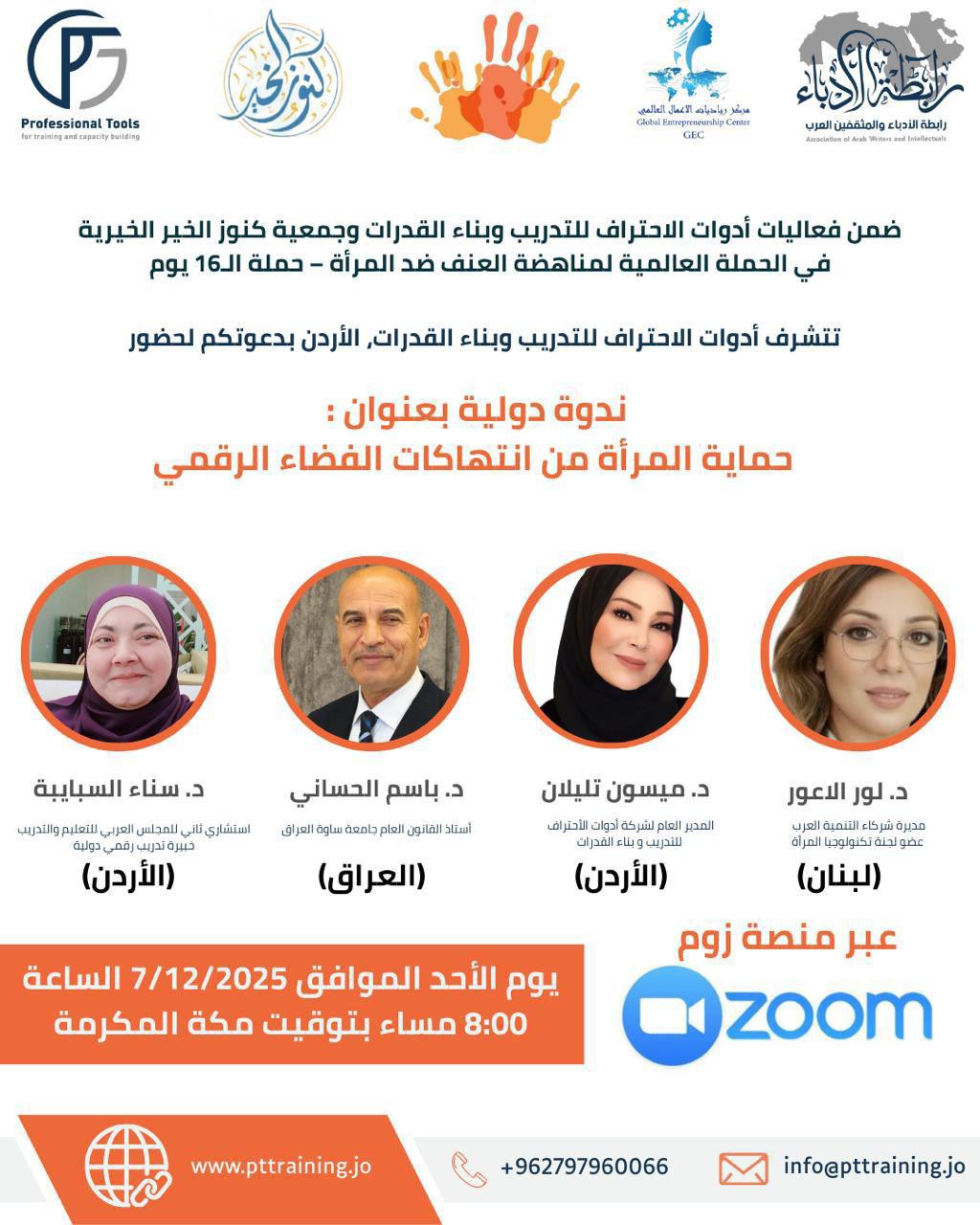 القلعة نيوز- نظّمت شركة أدوات الاحتراف للتدريب وبناء القدرات، بالتعاون مع جمعية كنوز الخير الخيرية ورابطة الأدباء والمثقفين العرب – الذراع الثقافي للشركة – وبالشراكة مع مركز رياديات الأعمال التابع للهيئة العالمية الأمريكية للاختراع والتنمية والاستثمار، ندوة دولية متخصصة حملت عنوان «حماية المرأة من انتهاكات الفضاء الرقمي»، وذلك في إطار فعاليات الحملة العالمية 16 يوم لمناهضة العنف ضد المرأة، وبمشاركة خبراء من العراق ولبنان والأردن.