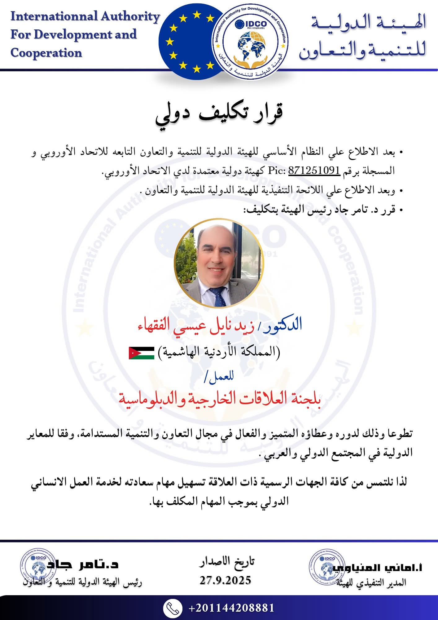 القلعة نيوز- قررت الهيئة الدولية للتنمية والتعاون التابعة لاتحاد الأوروبي (IDCO) تكليف الدكتور زيد نايل عيسي الفقهاء