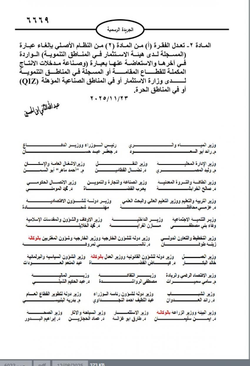 وبحسب معدل النظام تعدل الفقرة (أ) من المادة (۲) من النظام الأصلي بإلغاء عبارة المسجلة لدى هيئة الاستثمار في المناطق التنموية الواردة في آخرها والاستعاضة عنها بعبارة (وصناعة مدخلات الانتاج المكملة للقطاع المقامة أو المسجلة في المناطق التنموية لدى وزارة الاستثمار أو في المناطق الصناعية المؤهلة (QIZ) أو في المناطق الحرة).