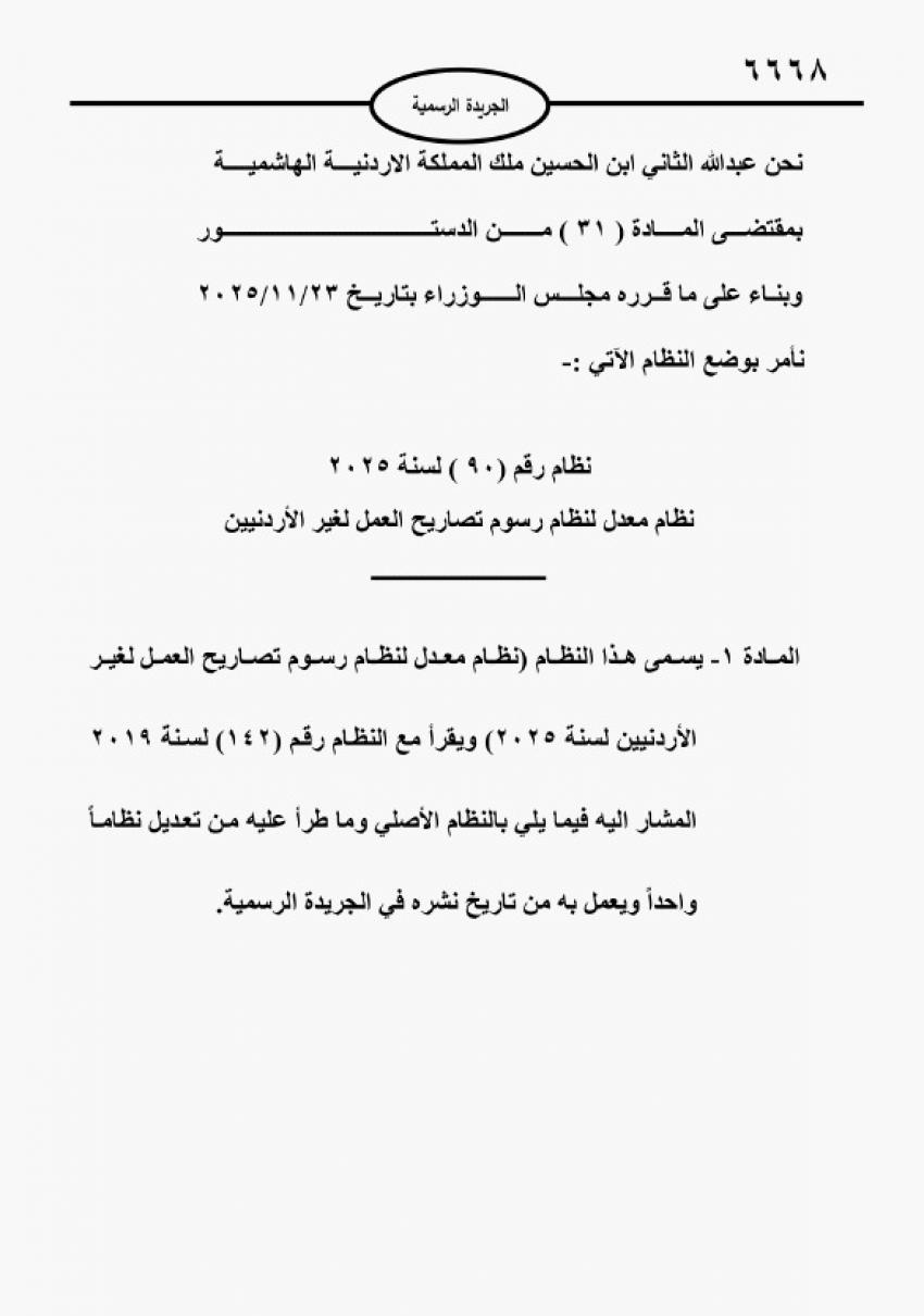 القلعة نيوز- صدرت الإرادة الملكية السامية،الإثنين، بالموافقة على نظام معدل لنظام رسوم تصاريح العمل لغير الأردنيين لسنة ۲٠٢٥، وما طرأ عليه من تعديل نظام واحد ويعمل به من تاريخ نشره في الجريدة الرسمية.