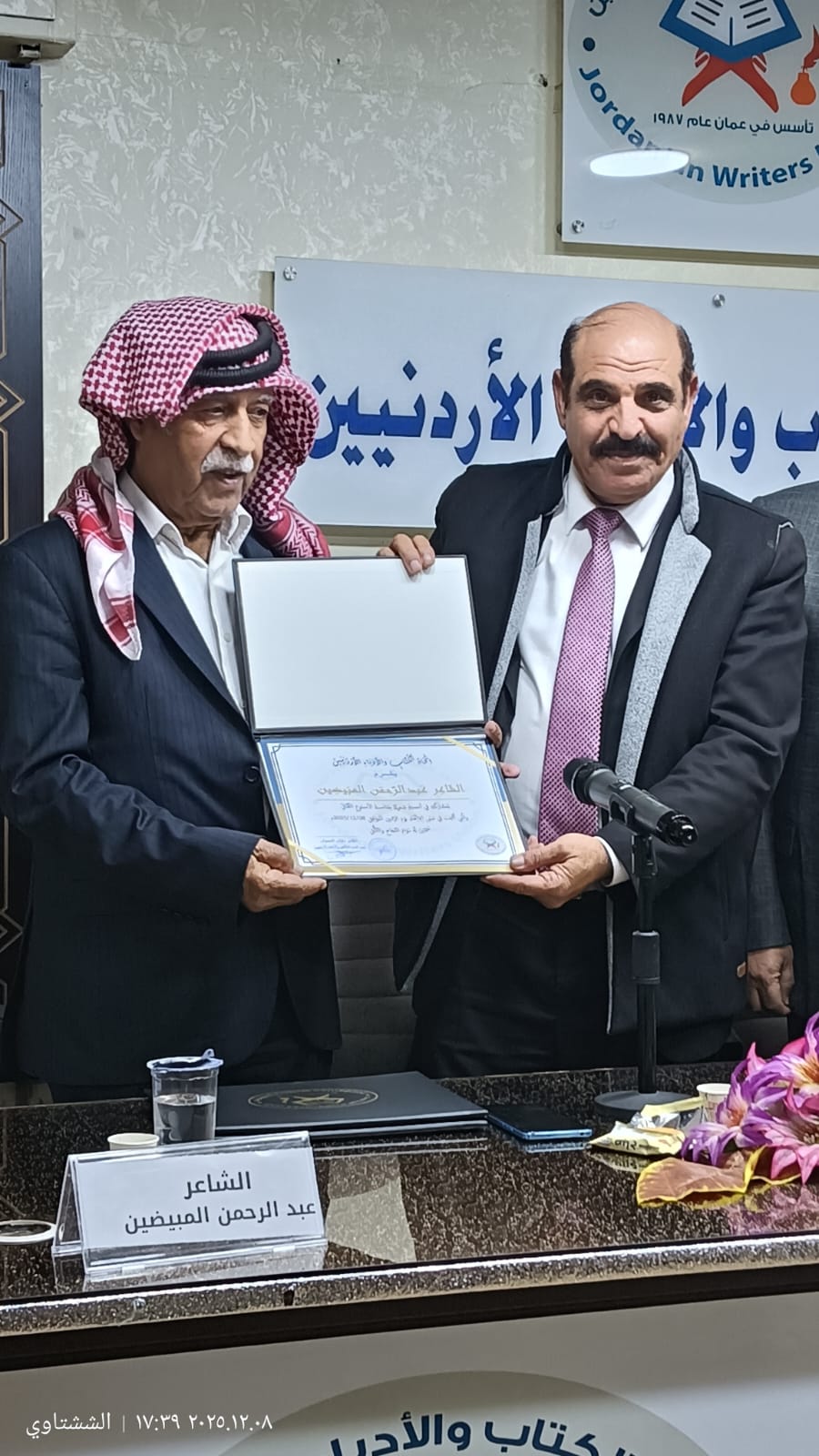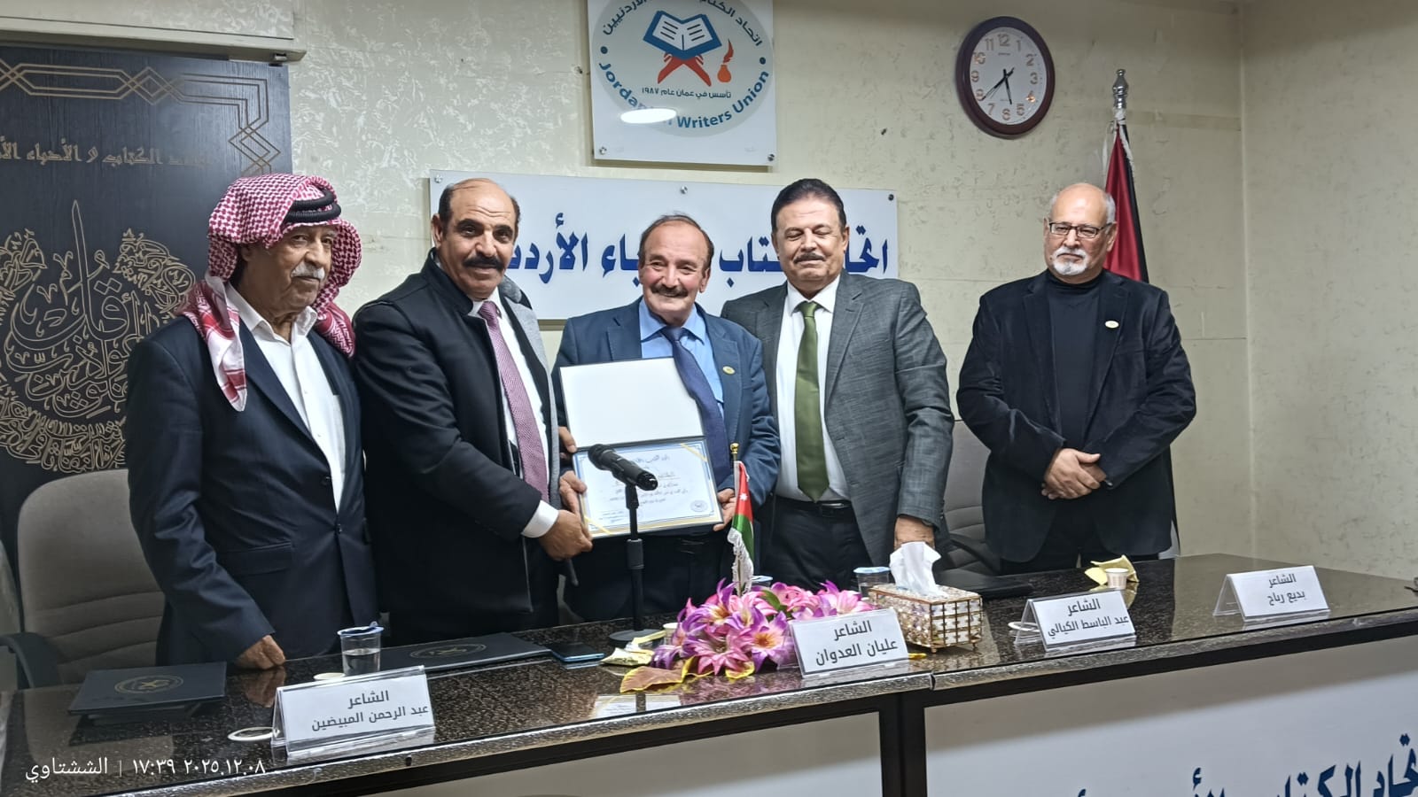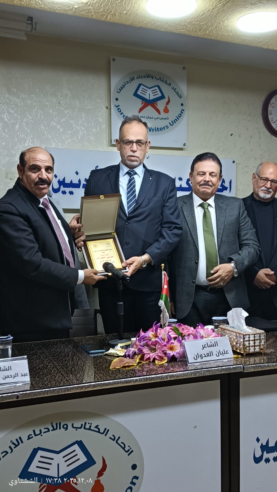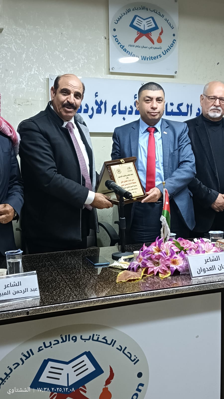 والمنجزات الوطنية التي تحققت في عهده الميمون، وانتقل في قصيدته الثانية الى فضاءات البوح العاطفي بقصيدة من الشعر العمودي الغزلي بعنوان "ملاك الروح"، وختم قراءاته بقصيدة رثائية لشاعرين من مؤسسي "الاتحاد" هما الراحلان سميح الشريف وعطالله ابو زياد حملت عنوان "يا فارسي الشعر..وداعا".