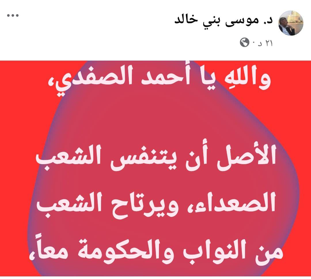 وأضاف "الدكتور بني خالد "في منشور عبر صفحته على الفيسبوك قائلاً: واللهِ يا أحمد الصفدي، الأصل أنّ يتنفس الشعب الصعداء، ويرتاح الشعب من النواب والحكومة معاً، أتعبتمونا حقاً.