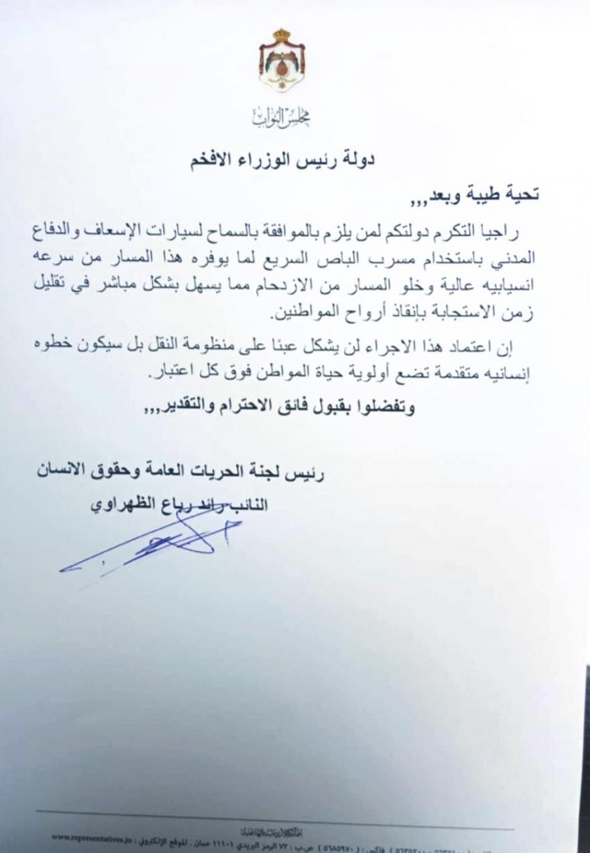 القلعة نيوز- قدم رئيس لجنة الحريات العامة وحقوق الانسان النائب رائد رباع الظهراوي، طلبا الى رئيس الوزراء يطالب فيه بالسماح لسيارات الإسعاف والدفاع المدني باستخدام مسرب الباص السريع لما يوفره هذا المسار من سرعة انسيابية عالية وخلو المسار من الازدحام مما يسهل بشكل مباشر في تقليل زمن الاستجابة بإنقاذ أرواح المواطنين.