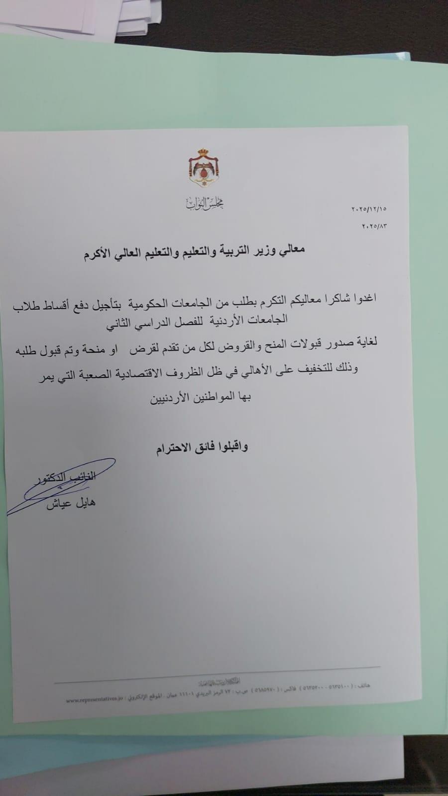 القلعة نيوز: وجه النائب الدكتور هايل عياش كتابا إلى وزير التربية والتعليم الدكتور عزمي محافظة يطالب فيه بتأجيل أقساط طلبة الجامعات الأردنية للفصل الدراسي الثاني لحين صدور نتائج المنح والقروض ..وتاليًا نص المذكرة :