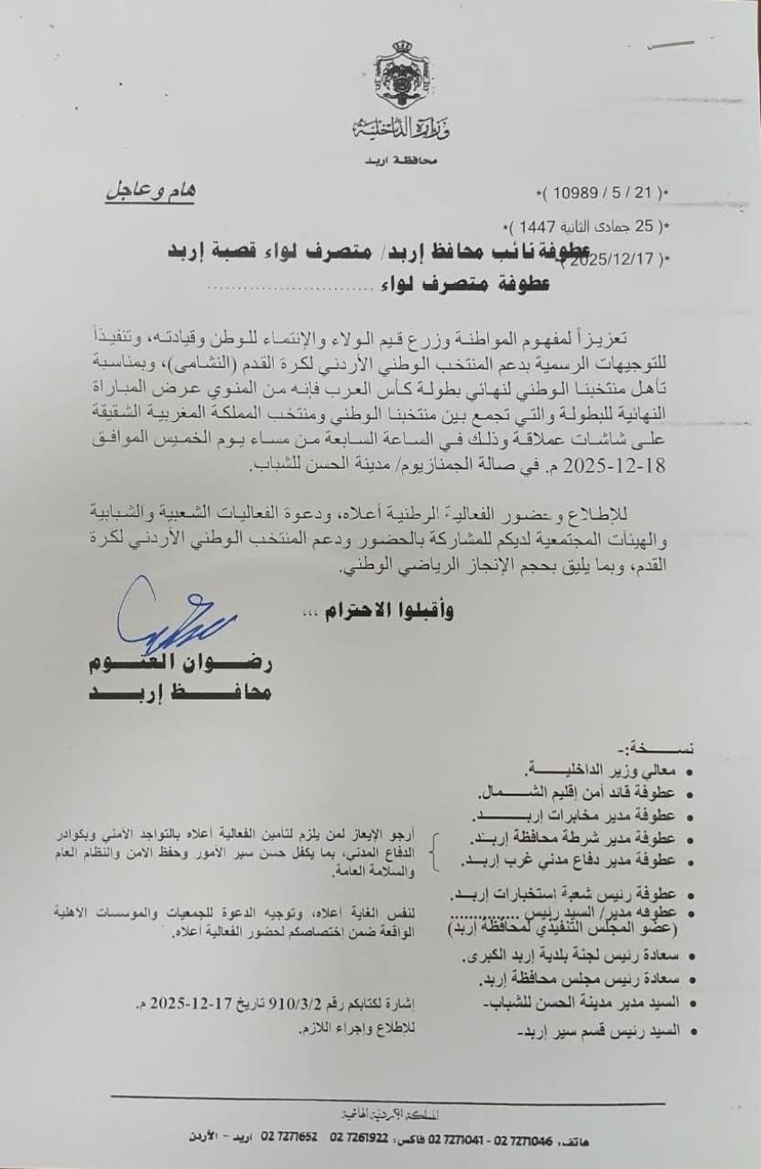 القلعة نيوز- أوعز محافظ اربد رضوان العتوم لحضور المباراة النهائية بين منتخبنا الوطني (النشامى) ومنتخب المملكة المغربية الشقيقة والمنوي عرضها في الساعة السابعة من مساء يوم الخميس الموافق 18/12/2025 في صالة الجمنازيوم/ مدينة الحسن للشباب على شاشات عملاقة ودعوة الفعاليات الشعبية والشبابية والهيئات المجتمعية للمشاركة بالحضور ودعم المنتخب الوطني وبما يليق بحجم الانجاز الرياضي الوطني.