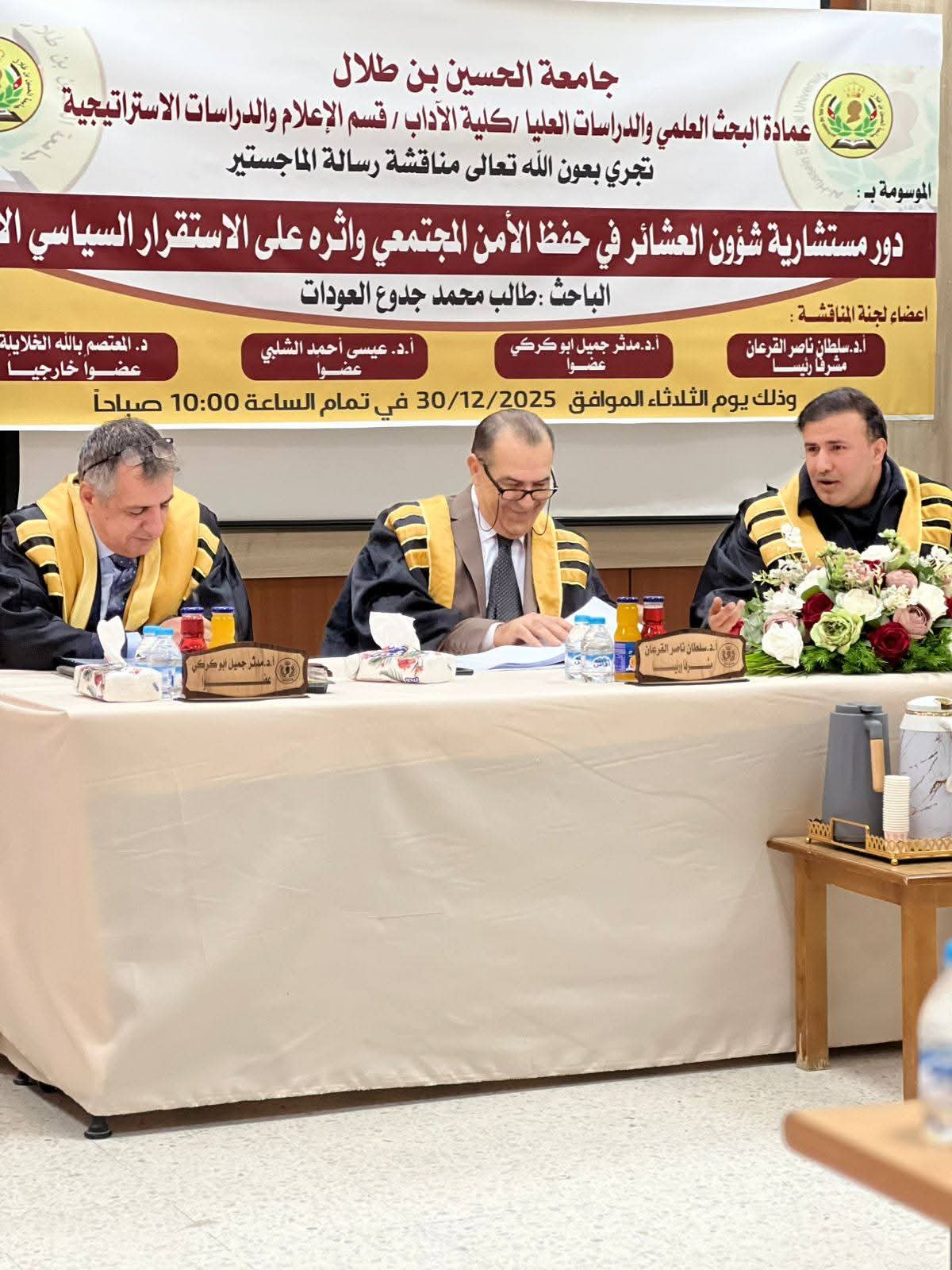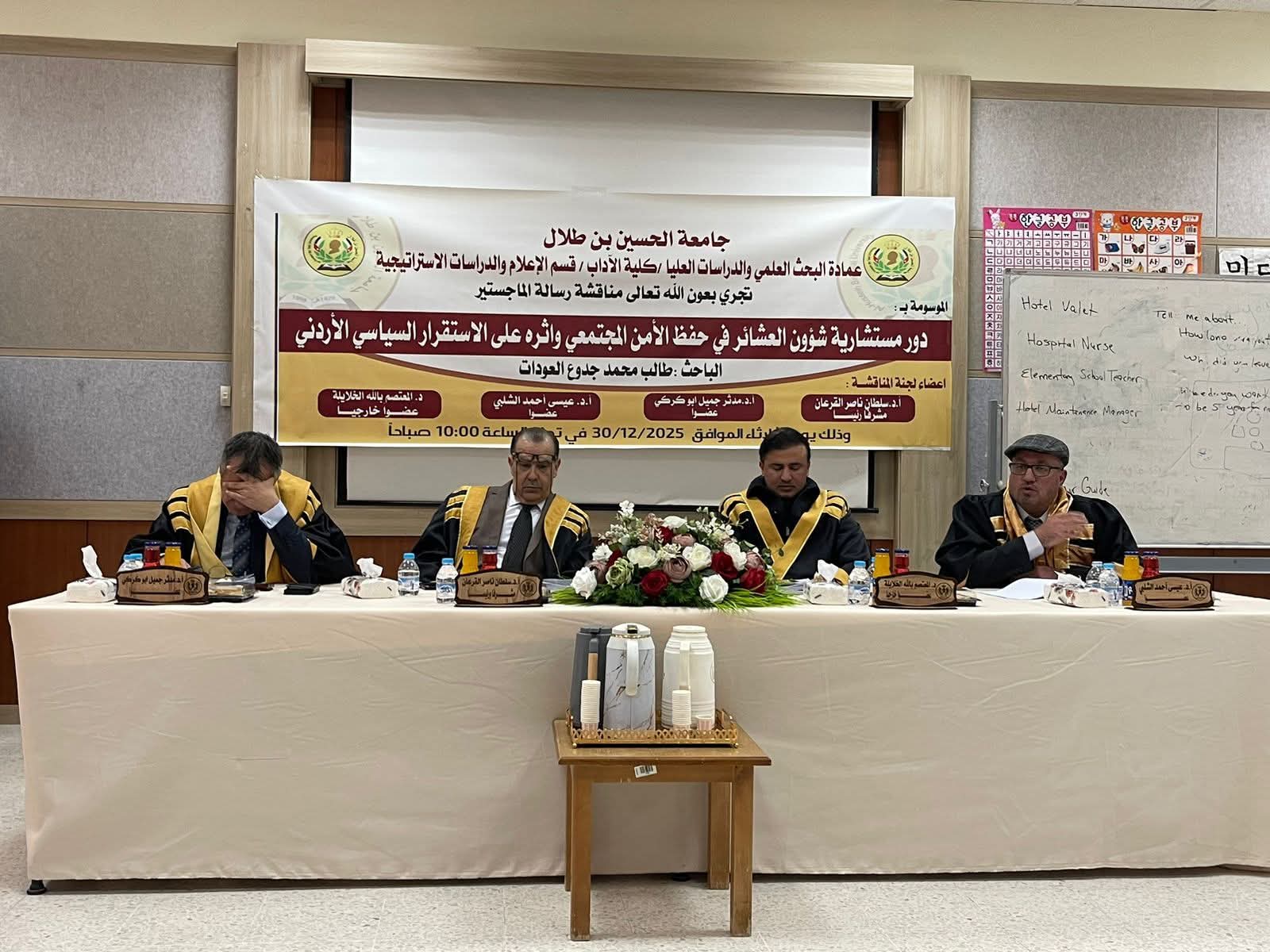 ناقش الشيخ والقاضي العشائري طالب محمد جدوع العودات الحويطات رسالة الماجستير في تخصص الدراسات الاستراتيجية،بدرجة الامتياز، والموسومة بعنوان:
