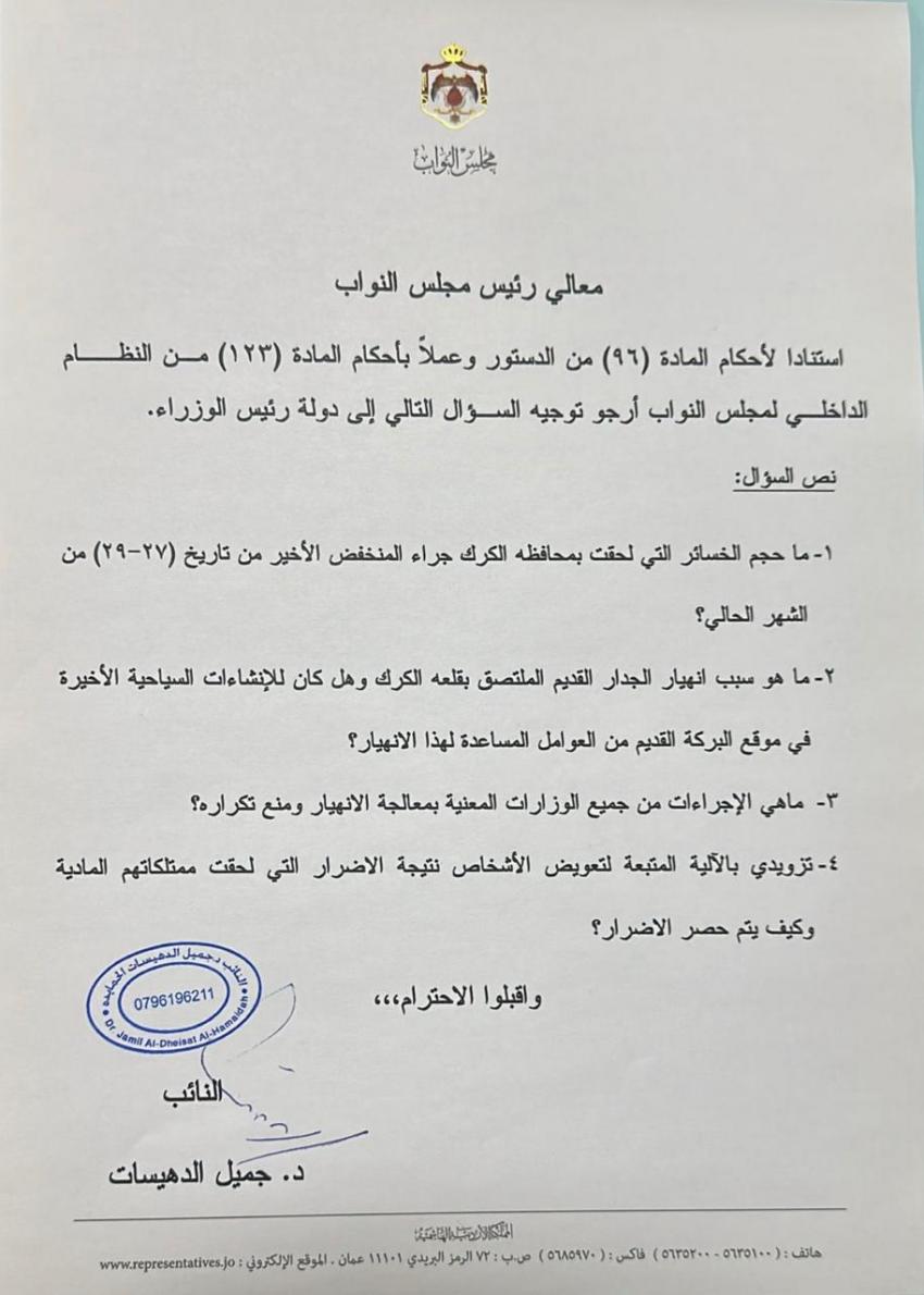 القلعة نيوز - وجه النائب جميل الدهيسات عدة اسئلة لرئيس الوزراء جعفر حسان حول الخسائر التي لحقت بمحافظة الكرك جراء المنخفض الأخير.
