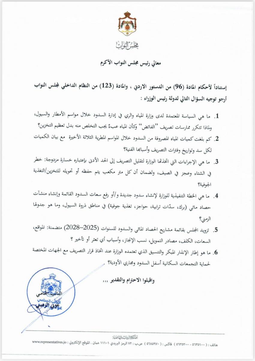 القلعة نيوز - وجه النائب عوني الزعبي، سؤالا نيابيا إلى رئيس الوزراء حول سياسة وزارة المياه والري في إدارة السدود خلال مواسم الأمطار والسيول.