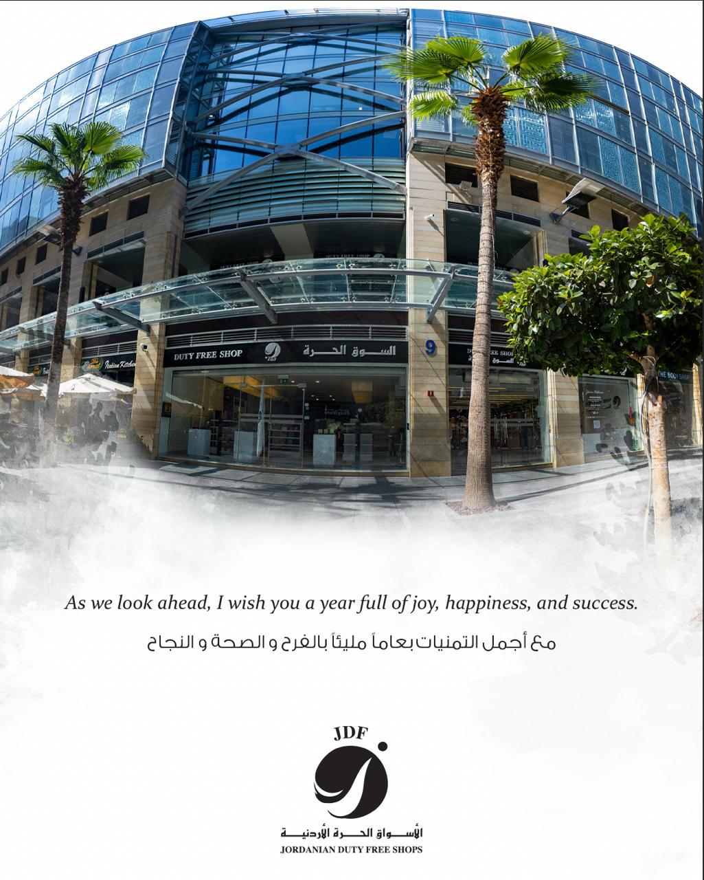 تتقدم رئيس مجلس ادارة شركة الاسواق الحرة الاردنية والرئيس التنفيذي وبالنيابة عن كافة العاملين في الشركة من مقام حضرة صاحب الجلالة الهاشمية الملك عبدالله الثاني المعظم وولي عهده المحبوب سمو الامير الحسين بن عبدالله الثاني ومن الاسرة الهاشمية والاردنية الواحدة بأصدق مشاعر التهنئة والتبريك بمناسبة حلول العام الميلادي الجديد 2026.