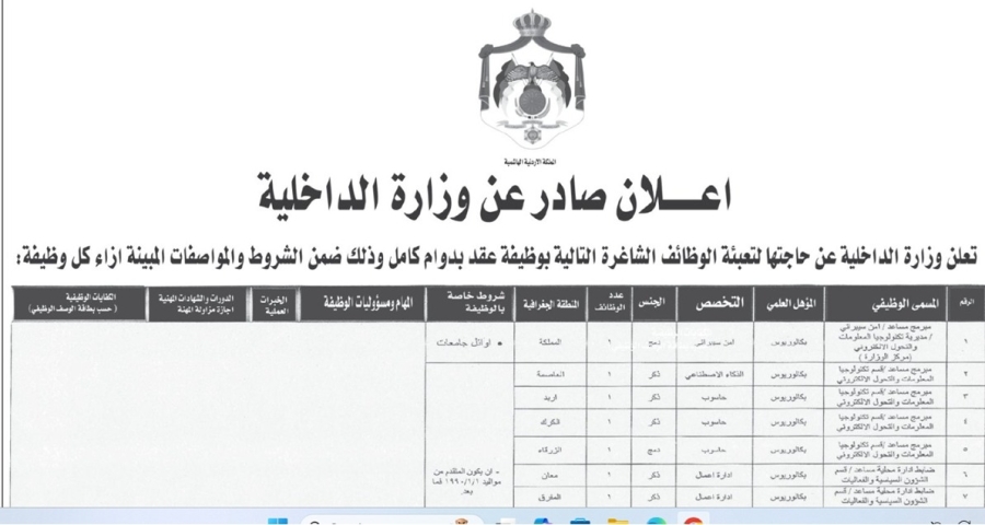 القلعة نيوز:- اعلنت وزارة الداخلية، اليوم الاثنين عن حاجتها لتعبئة وظائف شاغرة.