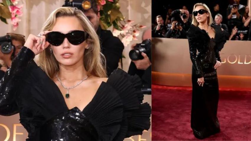 واعتمدت النجمة مايلي سايروس ثوباً من الباييت الأسود من دار Saint Laurent تزين بطبقات من القماش على شكل مروحة عند الكتفين. نسقته مع نظارات شمسية سوداء وعقد ماسي من Tiffany&Co تزين بحجر من الزمرد يفوق وزنه 15 قيراطاً بالإضافة إلى خواتم وأقراط ماسية.